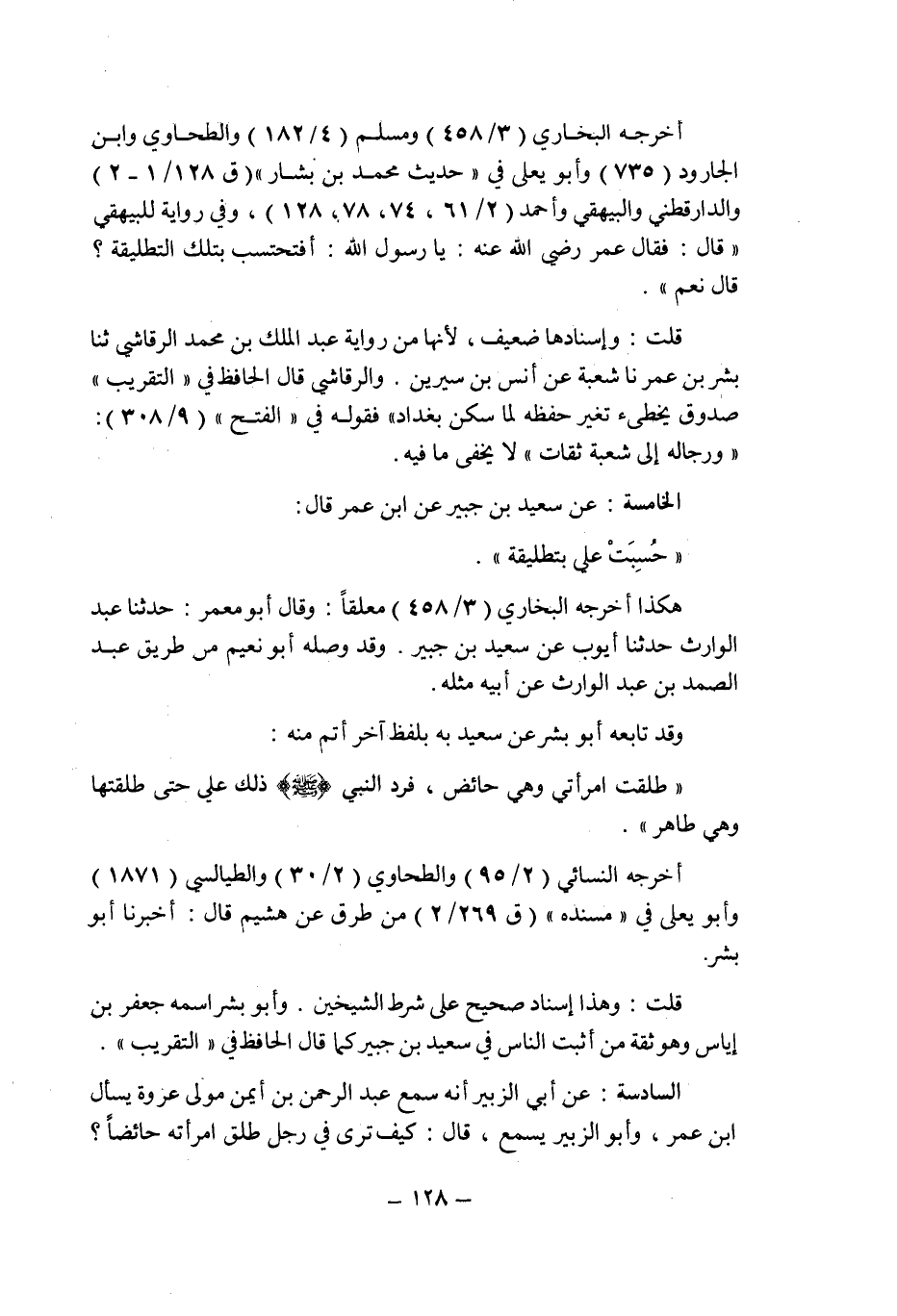 أخرجه البخارى (3/458) ومسلم (4/182) والطحاوى وابن الجارود (735) وأبو يعلى فى " حديث محمد بن بشار " (ق 128/1 ـ 2) والدارقطنى والبيهقى وأحمد (2/61 , 74 , 78 , 128) , وفى رواية للبيهقى " قال: فقال عمر رضى الله عنه: يا رسول الله: أفتحتسب بتلك التطليقة؟ قال: نعم ".