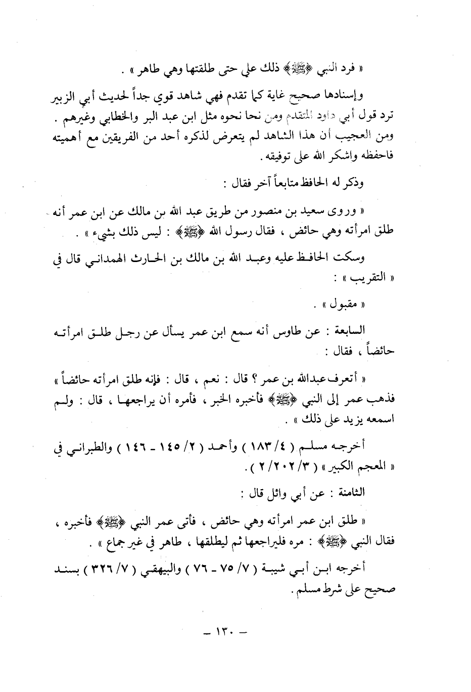 السابعة: عن طاوس أنه سمع ابن عمر يسأل عن رجل طلق امرأته حائضا فقال: " أتعرف عبد الله بن عمر؟ قال: نعم , قال: فإنه طلق امرأته حائضا , فذهب عمر إلى النبى صلى الله عليه وسلم فأخبره الخبر , فأمره أن يراجعها , قال: ولم أسمعه يزيد على ذلك ".