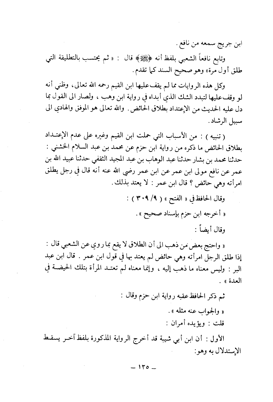 (تنبيه) : من الأسباب التى حملت ابن القيم وغيره على عدم الاعتداد بطلاق الحائض ما ذكره من رواية ابن حزم عن محمد بن عبد السلام الخشنى: حدثنا محمد بن بشار حدثنا عبد الوهاب بن عبد المجيد الثقفى حدثنا عبيد الله بن عمر عن نافع مولى ابن عمر عن ابن عمر رضى الله عنه أنه قال فى رجل يطلق امرأته وهى حائض؟ قال ابن عمر: لا يعتد بذلك.