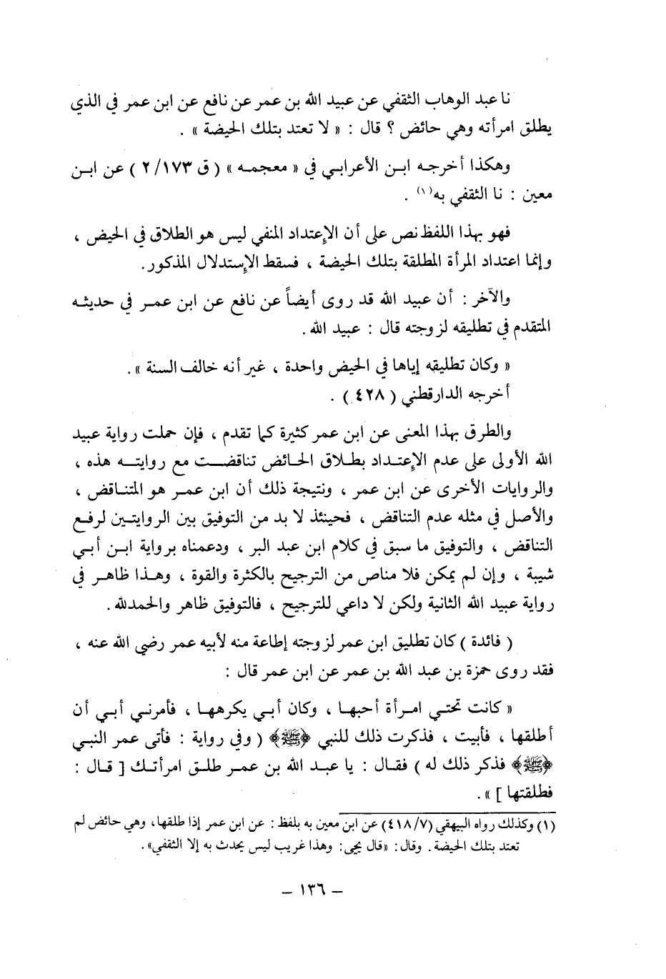 والطرق بهذا المعنى عن ابن عمر كثيرة كما تقدم , فإن حملت رواية عبيد الله الأولى على عدم الإعتداد بطلاق الحائض تناقضت مع روايته هذه , والروايات الأخرى عن ابن عمر , ونتيجة ذلك أن ابن عمر هو المتناقض , والأصل فى مثله عدم التناقض , فحينئذ لابد من التوفيق بين الروايتين لرفع التناقض , والتوفيق ما سبق فى كلام ابن عبد البر , ودعمناه برواية ابن أبى شيبة , وإن لم يمكن فلا مناص من الترجيح بالكثرة والقوة , وهذا ظاهر فى رواية عبيد الله الثانية ولكن لا داعى للترجيح , فالتوفيق ظاهر والحمد لله.