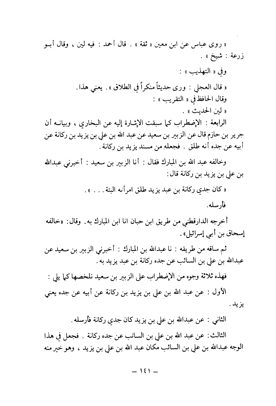فهذه ثلاثة وجوه من الإضطراب على الزبير بن سعيد نلخصها كما يلى: الأول: عن عبد الله بن على بن يزيد بن ركانة عن أبيه عن جده يعنى يزيد.