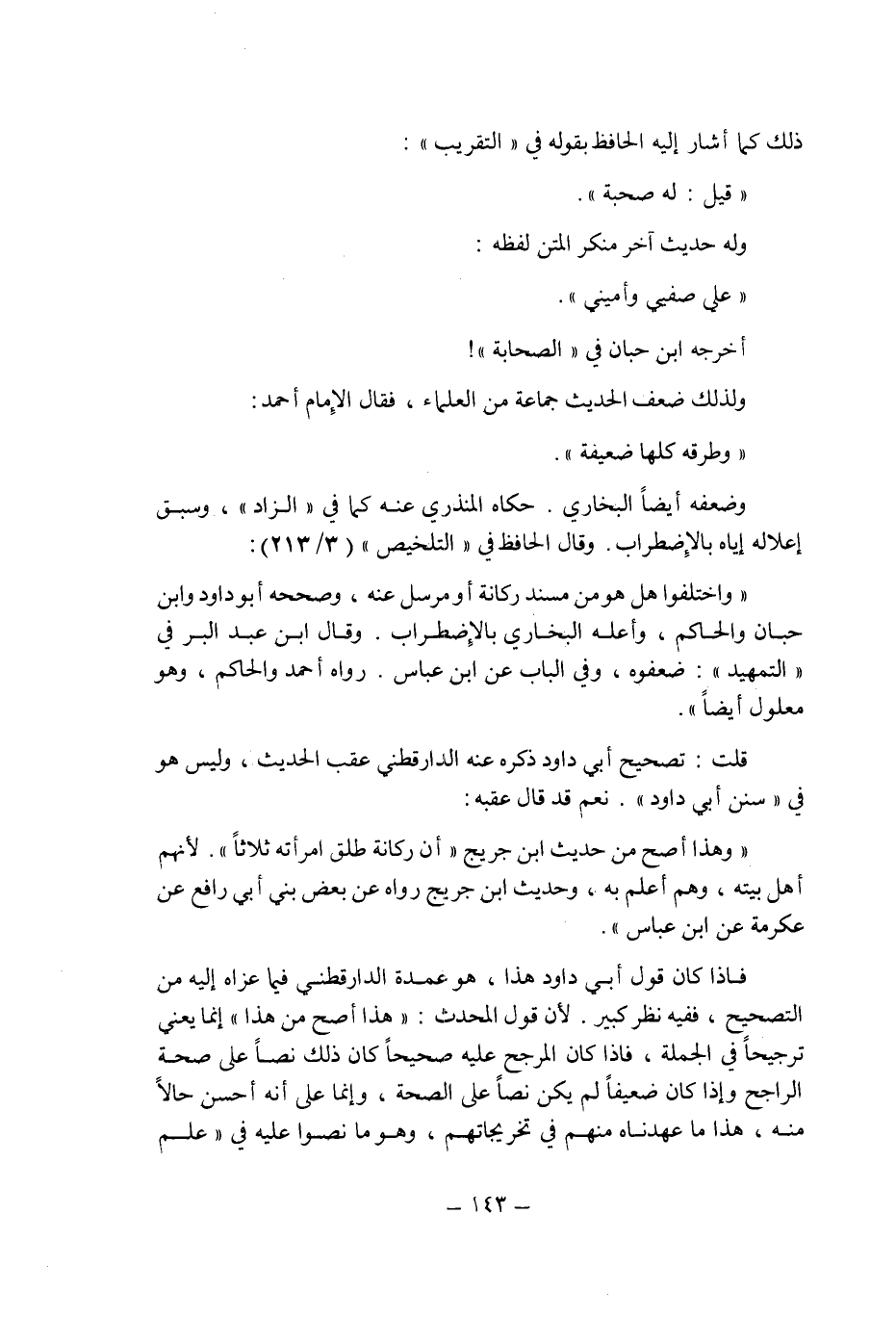 وقال الحافظ فى " التلخيص " (3/213) : " واختلفوا هل هو من مسند ركانة أو مرسل عنه , وصححه أبو داود وابن حبان والحاكم , وأعله البخارى بالاضطراب وقال ابن عبد البر فى " التمهيد ": ضعفوه.