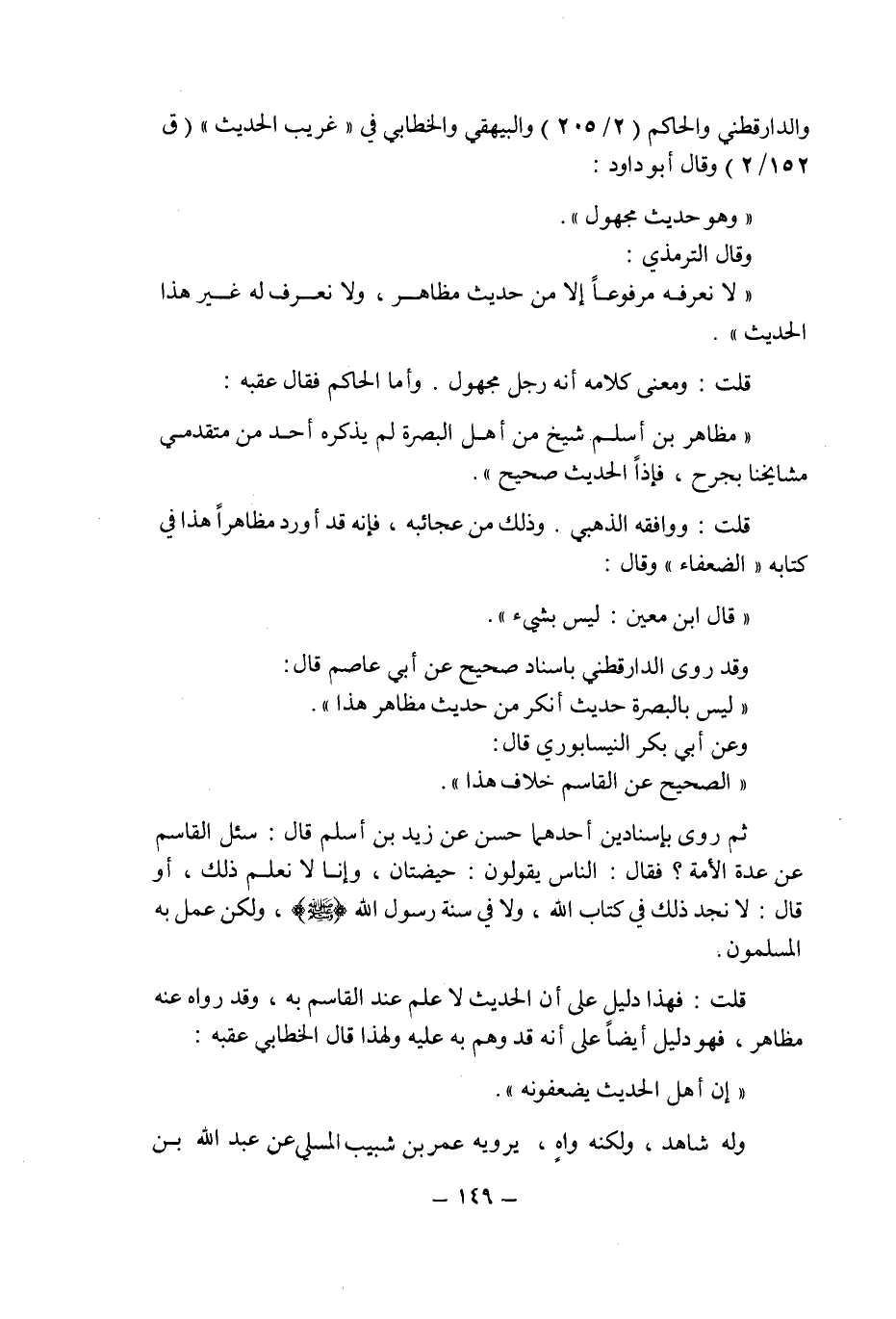 ثم روى بإسنادين أحدهما حسن عن زيد بن أسلم قال: سئل القاسم عن عدة الأمة؟ فقال: الناس يقولون: حيضتان , وإنا لا نعلم ذلك , أو قال: لا نجد ذلك فى كتاب الله , ولا فى سنة رسول الله صلى الله عليه وسلم , ولكن عمل به المسلمون قلت: فهذا دليل على أن الحديث لا علم عند القاسم به , وقد رواه عنه مظاهر , فهو دليل أيضا على أنه قد وهم به عليه ولهذا قال الخطابى عقبه: " إن أهل الحديث يضعفونه ".