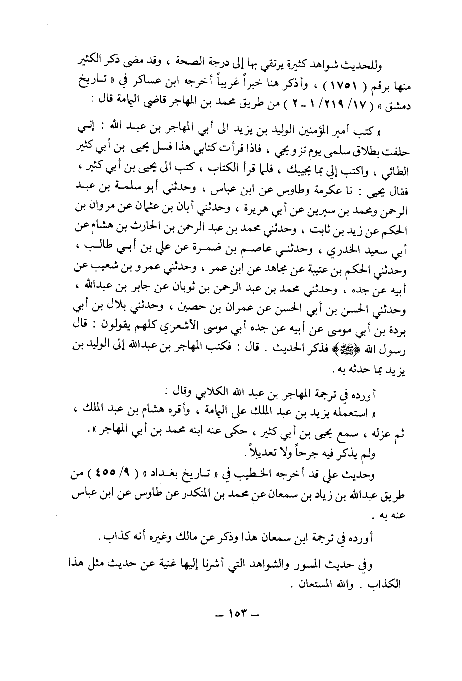 وللحديث شواهد كثيرة يرتقى بها إلى درجة الصحة , وقد مضى ذكر الكثير منها برقم (1751) , وأذكر هنا خبرا غريبا أخرجه ابن عساكر فى " تاريخ دمشق " (17/219/1 ـ 2) من طريق محمد بن المهاجر قاضى اليمامة قال: " كتب أمير المؤمنين الوليد بن يزيد إلى أبى المهاجر بن عبد الله: إنى حلفت بطلاق سلمى يوم تزويجى , فإذا قرأت كتابى فسل يحيى بن أبى كثير الطائى , واكتب إلى بما يجيبك , فلما قرأ الكتاب , كتب إلى يحيى بن أبى كثير , فقال يحيى: أخبرنا عكرمة وطاوس عن ابن عباس , وحدثنى أبو سلمة بن عبد الرحمن ومحمد بن سيرين عن أبى هريرة , وحدثنى أبان بن عثمان عن مروان بن الحكم عن زيد بن ثابت , وحدثنى محمد بن عبد الرحمن بن الحارث بن هشام عن أبى سعيد الخدرى , وحدثنى عاصم بن ضمرة عن على بن أبى طالب , وحدثنى الحكم بن عتيبة عن مجاهد عن ابن عمر , وحدثنى عمرو بن شعيب عن أبيه عن جده , وحدثنى محمد بن عبد الرحمن بن ثوبان عن جابر بن عبد الله , وحدثنى الحسن بن أبى الحسن عن عمران بن حصين , وحدثنى بلال بن أبى بردة بن أبى موسى عن أبيه عن جده أبى موسى الأشعرى كلهم يقولون: قال رسول الله صلى الله عليه وسلم فذكر الحديث.