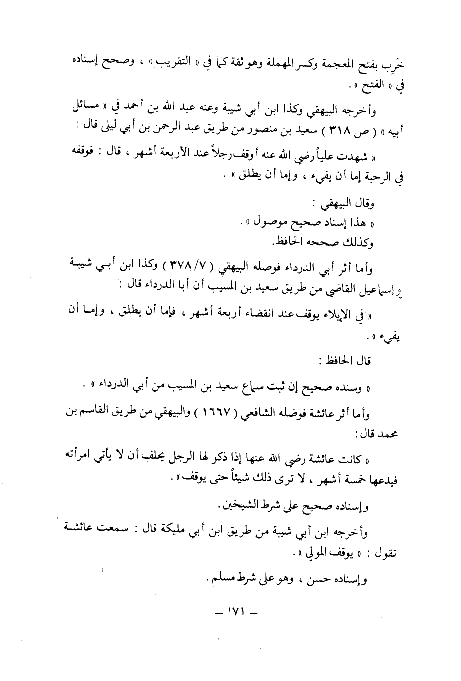 وأخرجه البيهقى وكذا ابن أبى شيبة وعنه عبد الله بن أحمد فى " مسائل أبيه " (ص 318) سعيد بن منصور من طريق عبد الرحمن بن أبى ليلى قال: " شهدت عليا رضى الله عنه أوقف رجلا عند الأربعة أشهر , قال: فوقفه فى الرحبة إما أن يفىء , وإما أن يطلق ".