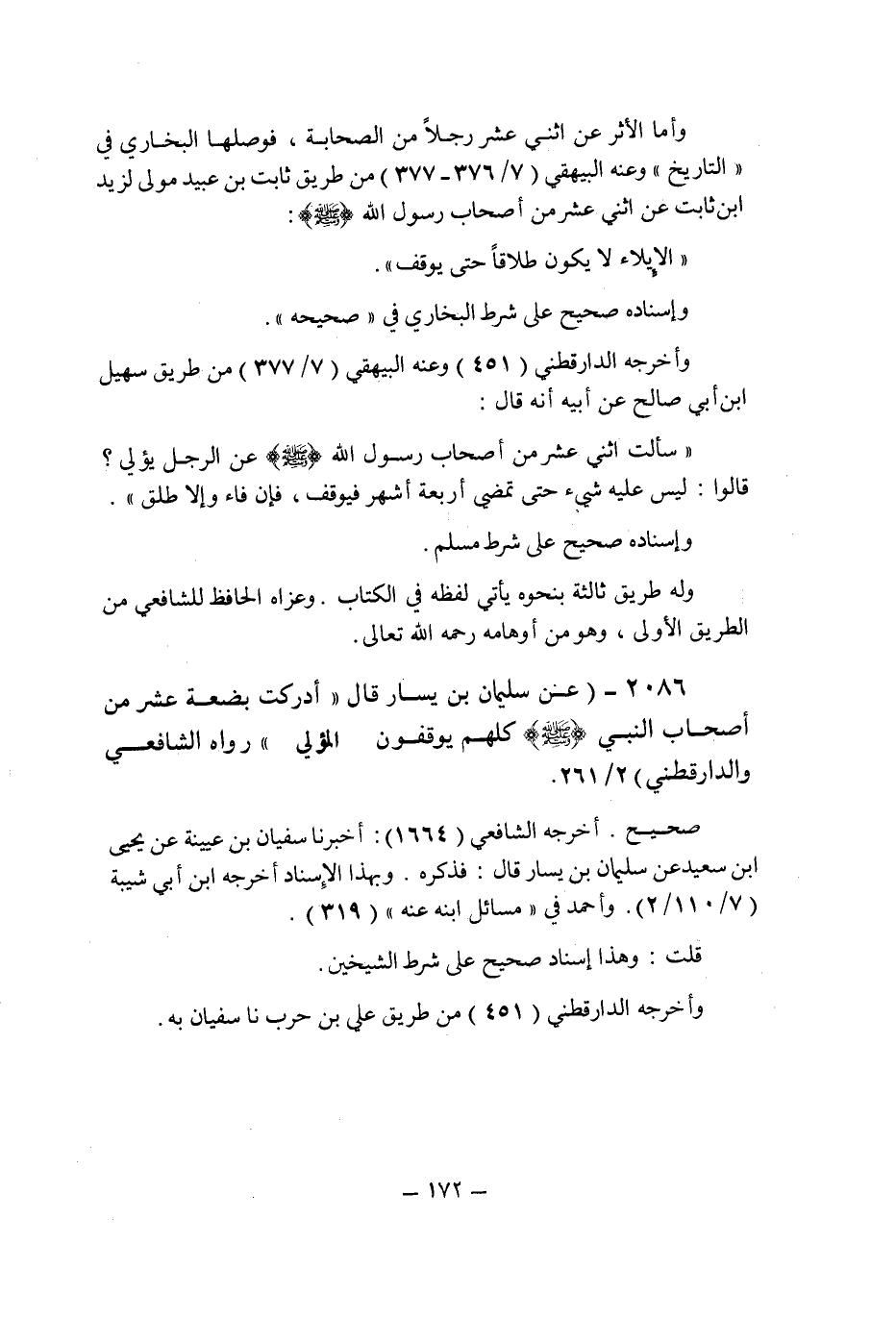 (2086) - (عن سليمان بن يسار قال: " أدركت بضعة عشر من أصحاب النبى صلى الله عليه وسلم كلهم يوقفون المؤلى " رواه الشافعى والدارقطنى (2/261) .