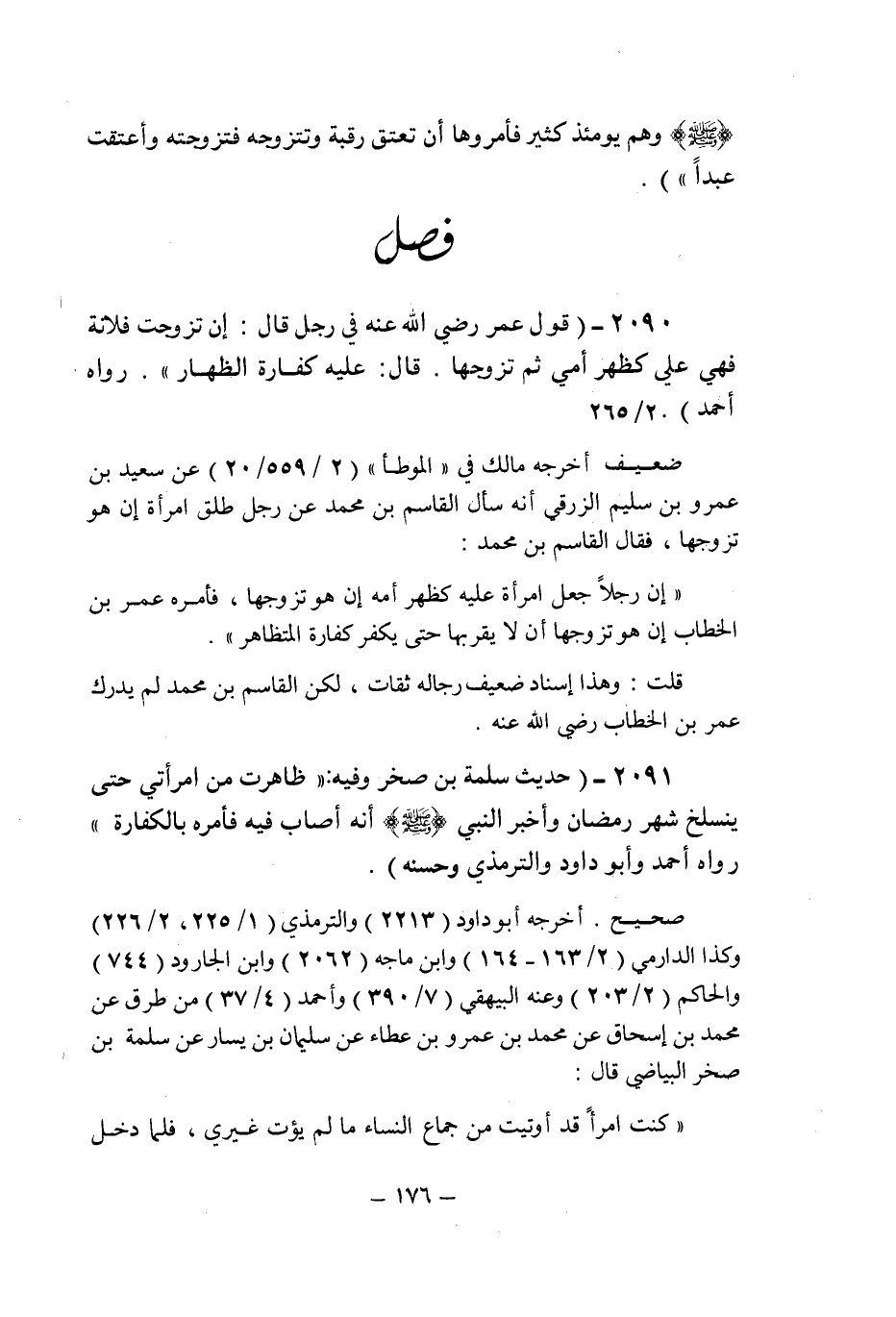 (2090) - (قول عمر رضى الله عنه فى رجل قال: " إن تزوجت فلانة فهى على كظهر أمى ثم تزوجها. قال: عليه كفارة الظهار " رواه أحمد (2/265) .