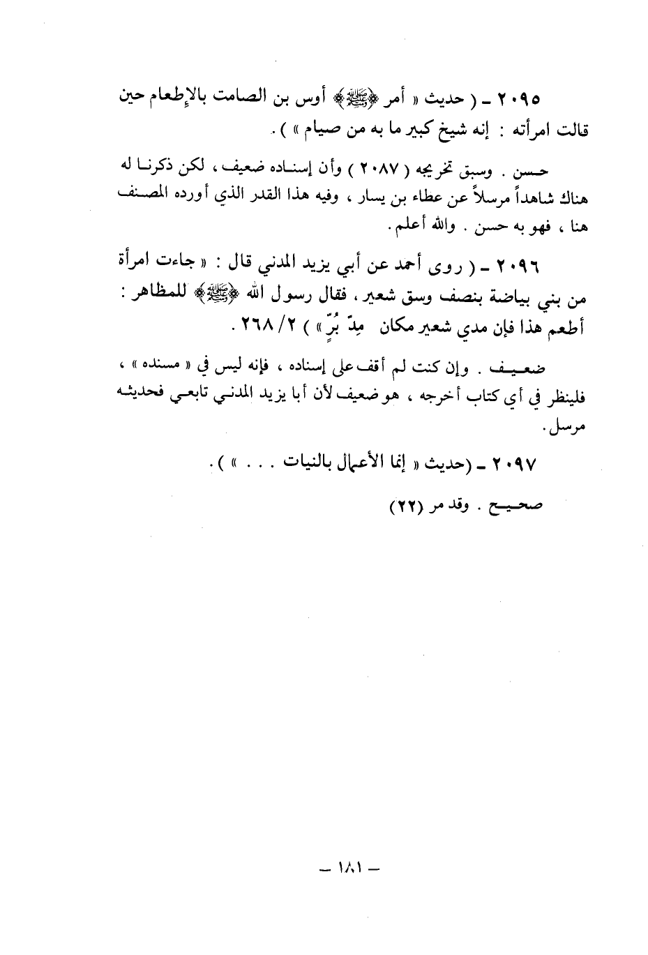 (2096) - (روى أحمد عن أبى يزيد المدنى قال: " جاءت امرأة من بنى بياضة بنصف وسق شعير , فقال رسول الله صلى الله عليه وسلم للمظاهر: أطعم هذا فإن مدى شعير مكان مد بر " (2/268) .