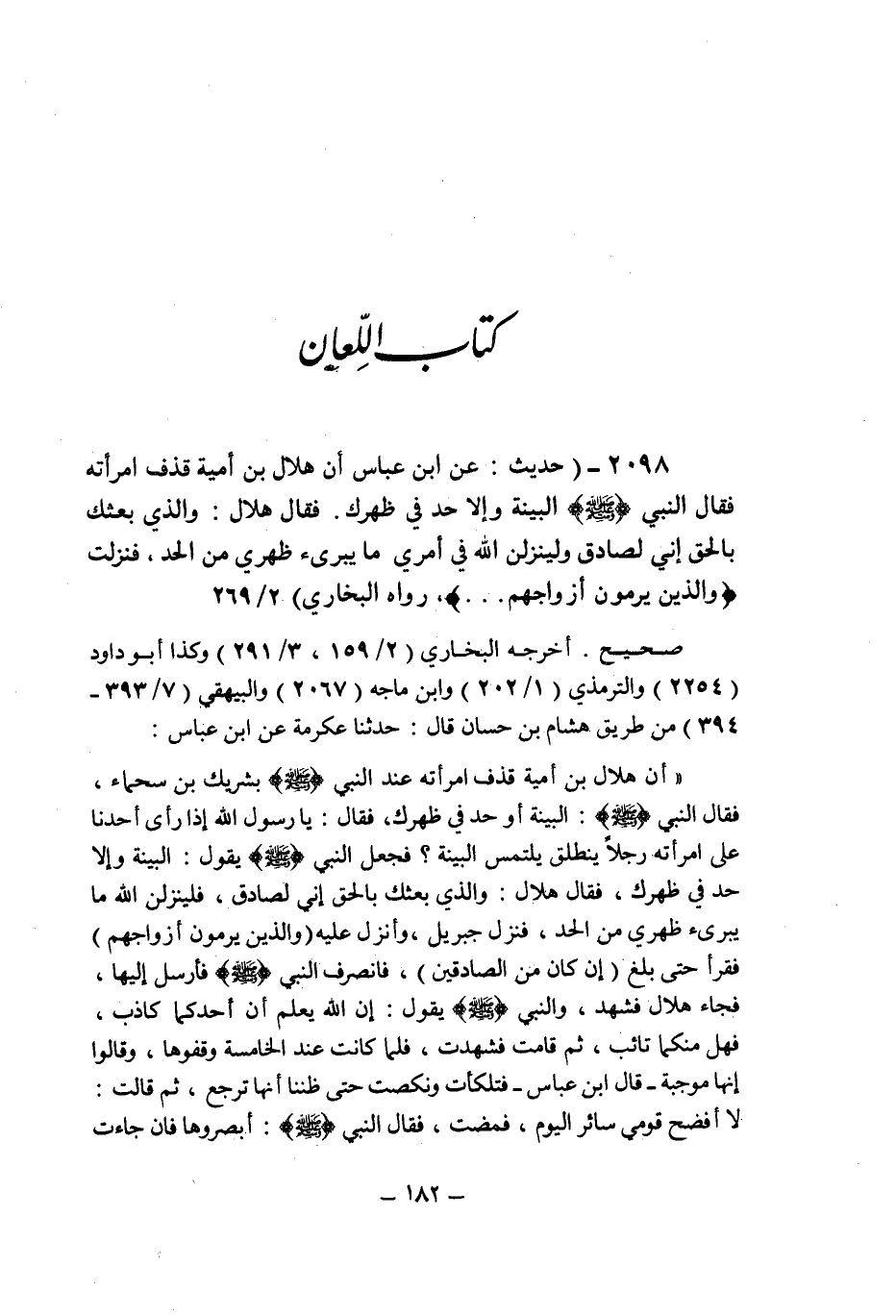 (2098) - (حديث: " عن ابن عباس أن هلال بن أمية قذف امرأته فقال النبى صلى الله عليه وسلم: البينة وإلا حد فى ظهرك. فقال هلال: والذى بعثك بالحق إنى لصادق ولينزلن الله فى أمرى ما يبرىء ظهرى من الحد , فنزلت (والذين يرمون أزواجهم ... ) " رواه البخارى (2/269) .