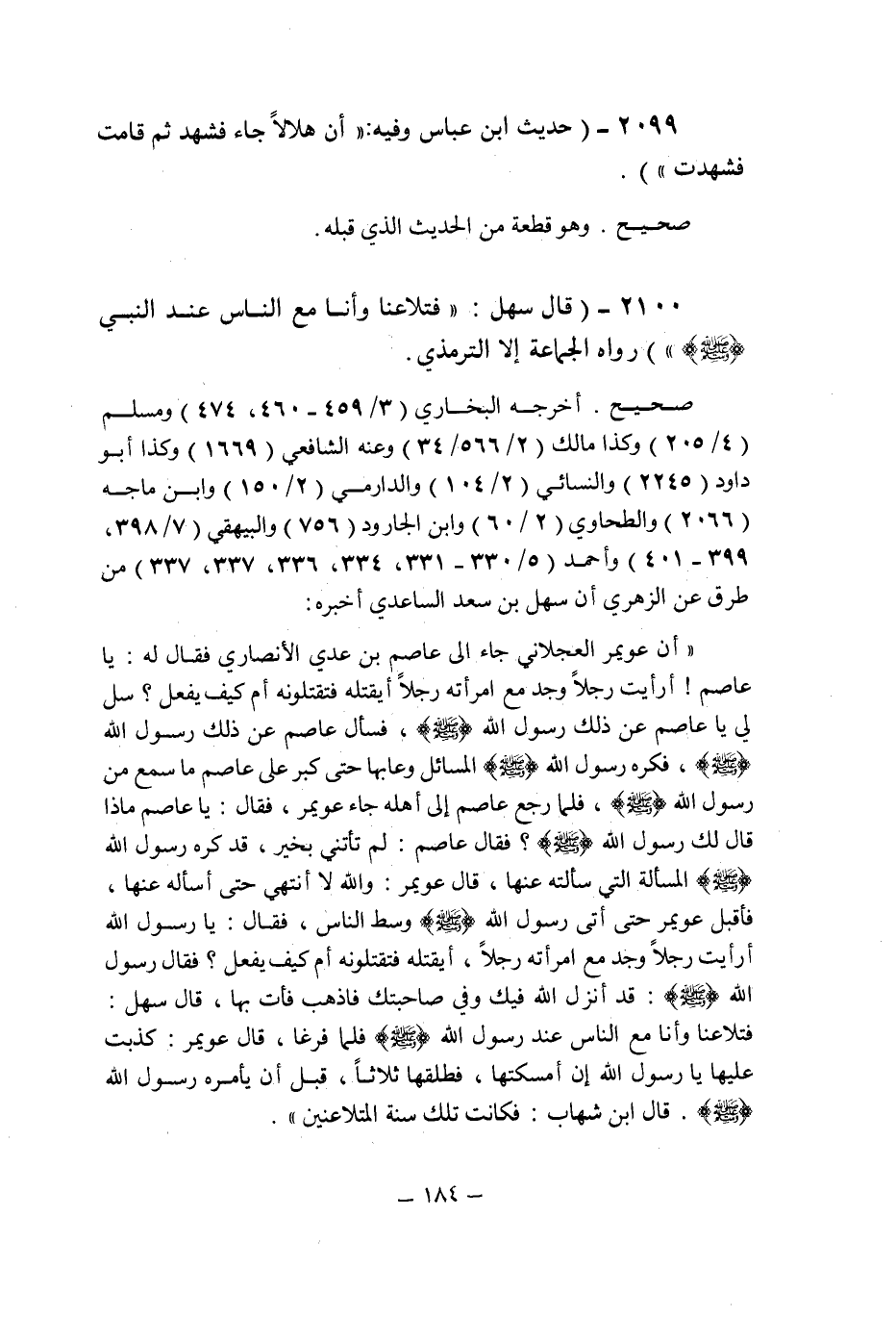 أخرجه البخارى (3/459 ـ 460 , 474) ومسلم (4/205) وكذا مالك (2/566/34) وعنه الشافعى (1669) وكذا أبو داود (2245) والنسائى (2/104) والدارمى (2/150) وابن ماجه (2066) والطحاوى (2/60) وابن الجارود (756) والبيهقى (7/398 , 399 ـ 401) وأحمد (5/330 ـ 331 , 334 , 336 , 337 , 337) من طرق عن الزهرى أن سهل بن سعد الساعدى أخبره: " أن عويمر العجلانى جاء إلى عاصم بن عدى الأنصارى فقال له: يا عاصم! أرأيت رجلا وجد مع امرأته رجلا أيقتله فتقتلونه أم كيف يفعل؟ سل لى يا عاصم عن ذلك رسول الله صلى الله عليه وسلم , فسأل عاصم عن ذلك رسول الله صلى الله عليه وسلم , فكره رسول الله صلى الله عليه وسلم المسائل وعابها حتى كبر على عاصم ما سمع من رسول الله صلى الله عليه وسلم , فلما رجع عاصم إلى أهله جاء عويمر , فقال يا عاصم ماذا قال لك رسول الله صلى الله عليه وسلم؟ فقال عاصم: لم تأتنى بخير , قد كره رسول الله صلى الله عليه وسلم المسألة التى سألته عنها , قال عويمر: والله لا أنتهى حتى أسأله عنها , فأقبل عويمر حتى أتى رسول الله صلى الله عليه وسلم وسط الناس , فقال: يا رسول الله أرأيت رجلا وجد مع امرأته رجلا , أيقتله فتقتلونه أم كيف يفعل؟ فقال رسول الله صلى الله عليه وسلم: قد أنزل الله فيك وفى صاحبتك فاذهب فأت بها , قال سهل: فتلاعنا وأنا مع الناس عند رسول الله صلى الله عليه وسلم فلما فرغا , قال عويمر: كذبت عليها يا رسول الله إن أمسكتها , فطلقها ثلاثا , قبل أن يأمره رسول الله صلى الله عليه وسلم.