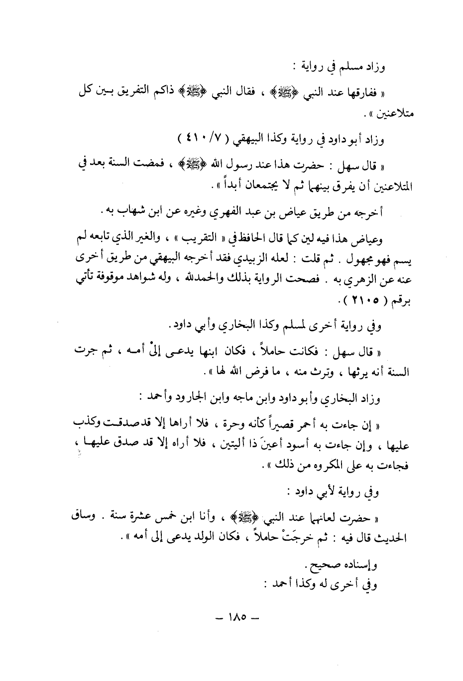 وفى رواية لأبى داود: " حضرت لعانهما عند النبى صلى الله عليه وسلم , وأنا ابن خمس عشرة سنة ـ وساق الحديث قال فيه: ـ ثم خرجت حاملا , فكان الولد يدعى إلى أمه " وإسناده صحيح.