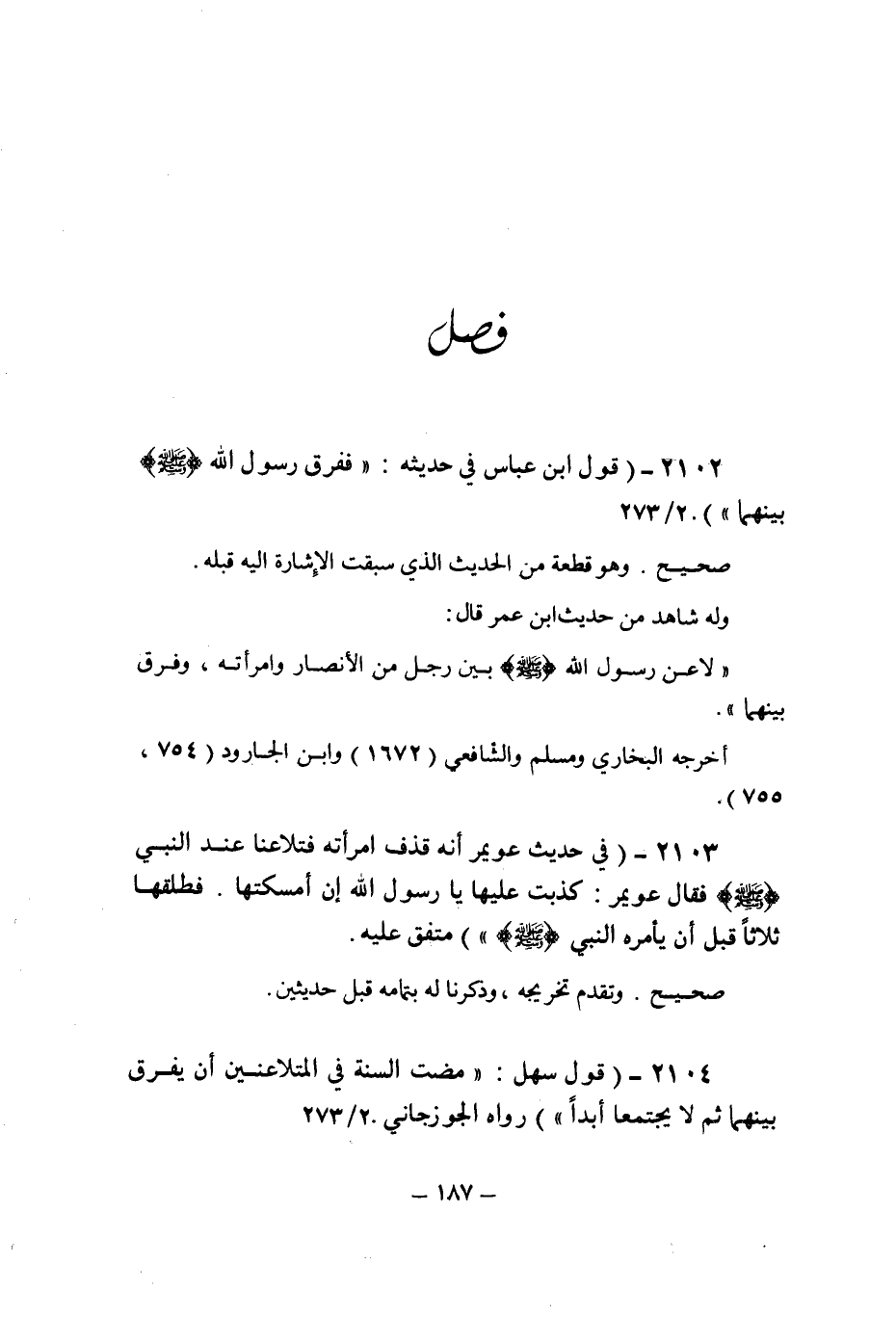 (2102) - (قول ابن عباس فى حديثه: " ففرق رسول الله صلى الله عليه وسلم بينهما " (2/273) .