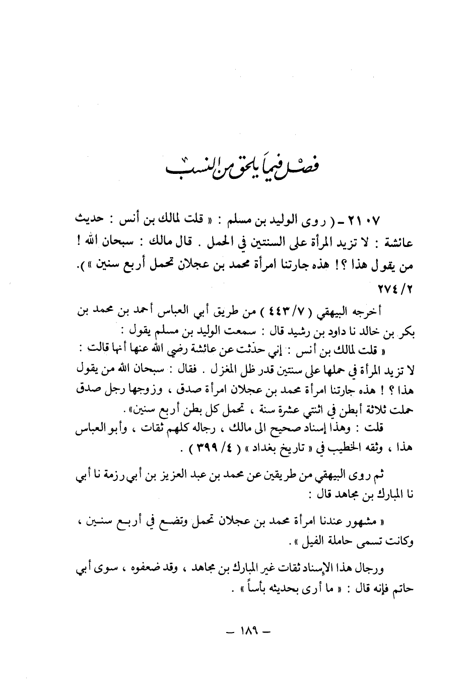 (2107) - (روى الوليد بن مسلم: " قلت لمالك بن أنس: حديث عائشة: لا تزيد المرأة على السنتين فى الحمل. قال مالك: سبحان الله! من يقول هذا؟ ! هذه جارتنا امرأة محمد بن عجلان تحمل أربع سنين " (2/274) .