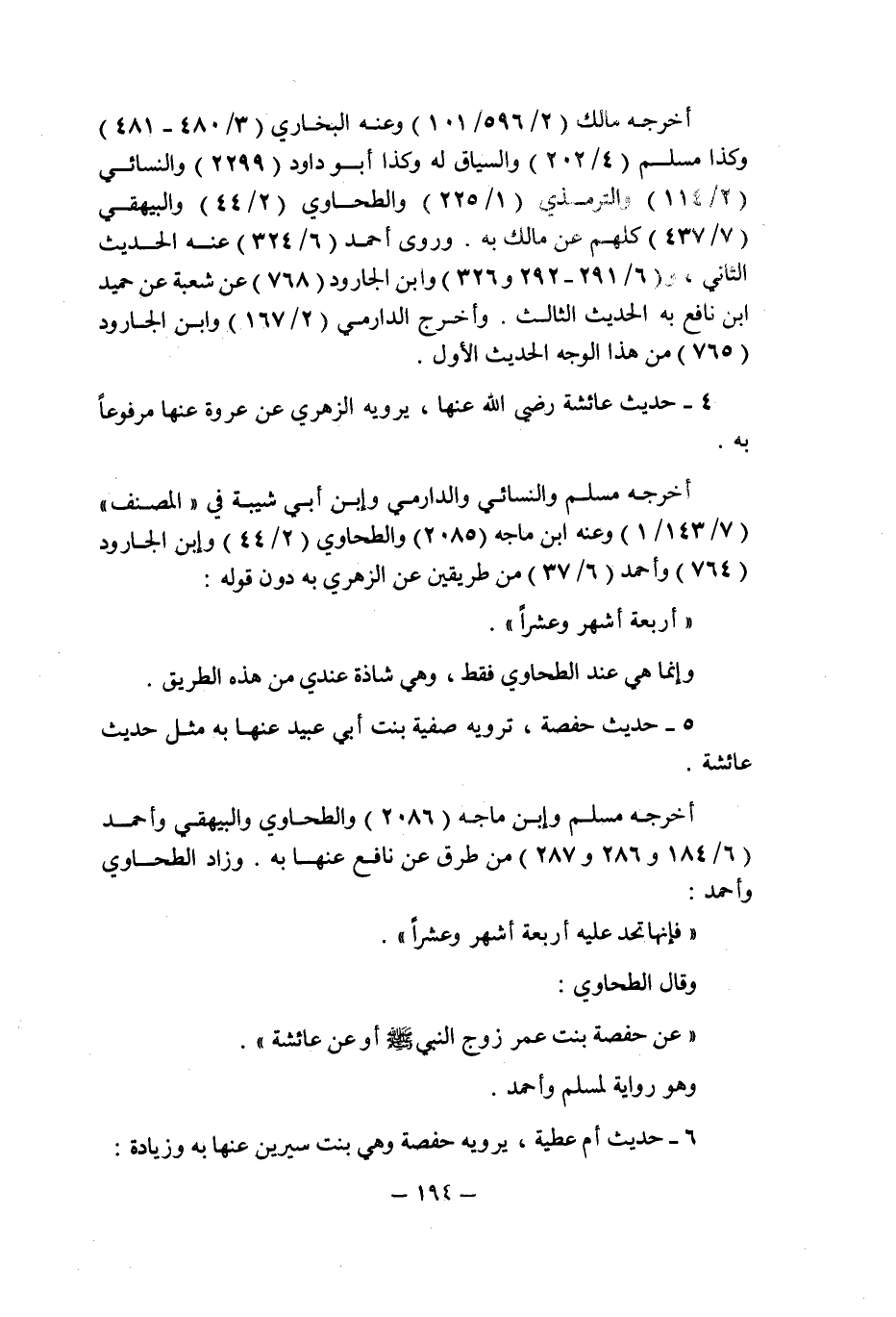 وزاد الطحاوى وأحمد " فإنها تحد عليه أربعة أشهر وعشرا " وقال الطحاوى: " عن حفصة بنت عمر زوج النبى صلى الله عليه وسلم أو عن عائشة ".