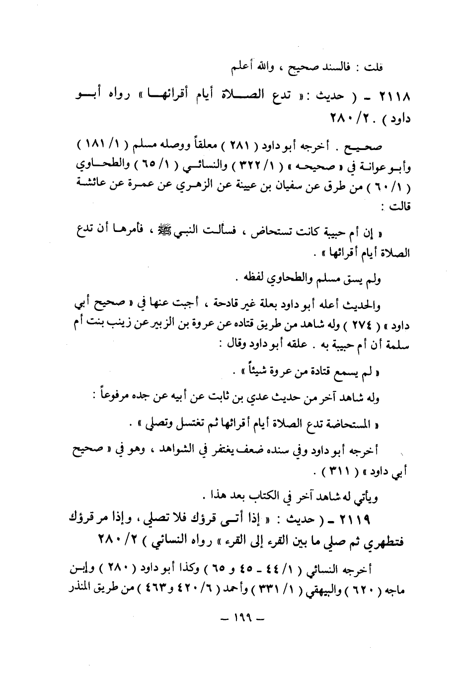 (2119) - (حديث: " إذا أتى قرؤك فلا تصلى , وإذا مر قرؤك فتطهرى ثم صلى ما بين القرء إلى القرء " رواه النسائى (2/280) .