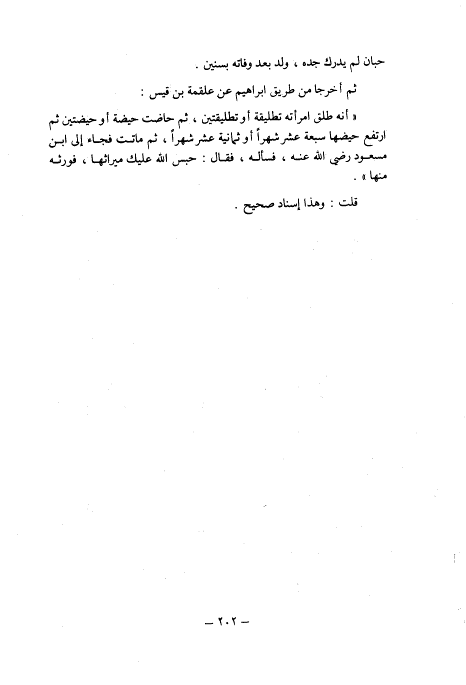 ثم أخرجا من طريق إبراهيم عن علقمة بن قيس: " أنه طلق امرأته تطليقة أو تطليقتين , ثم حاضت حيضة أو حيضتين ثم ارتفع حيضها سبعة عشر شهرا أو ثمانية عشر شهرا , ثم ماتت فجاء إلى ابن مسعود رضى الله عنه , فسأله , فقال: حبس الله عليك ميراثها , فورثه منها ".