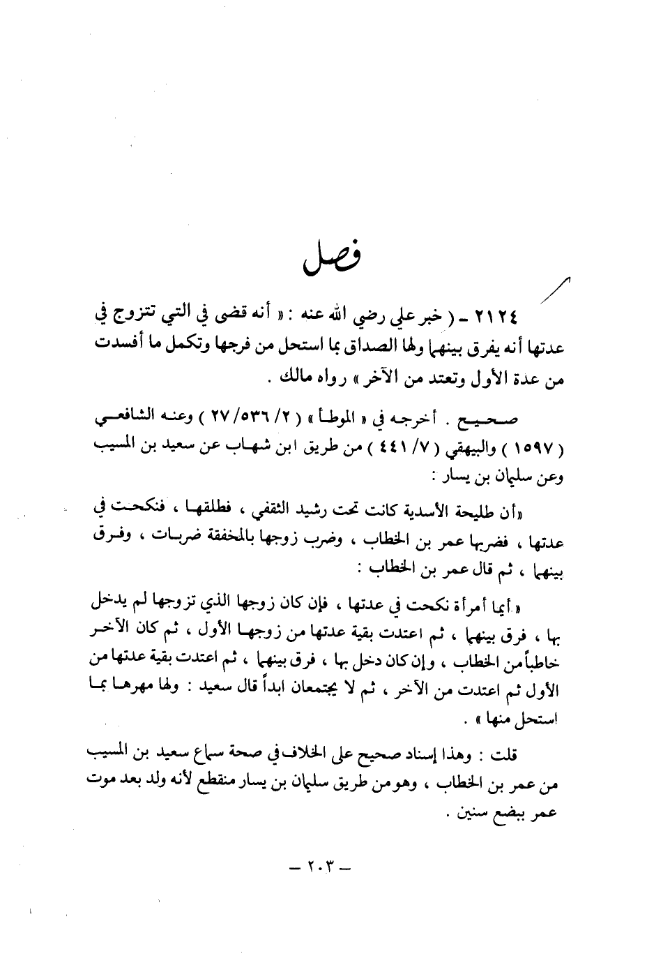 (2124) - (خبر على رضى الله عنه: " أنه قضى فى التى تتزوج فى عدتها أنه يفرق بينهما ولها الصداق بما استحل من فرجها وتكمل ما أفسدت من عدة الأول وتعتد من الآخر " رواه مالك.