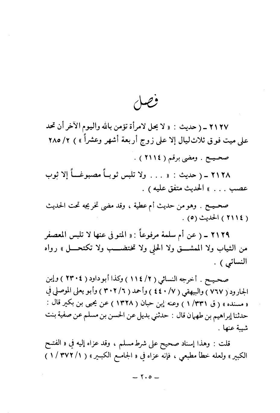 (2129) - (عن أم سلمة مرفوعا: " المتوفى عنها لا تلبس المعصفر من الثياب ولا الممشق ولا الحلى ولا تختضب ولا تكتحل " رواه النسائى.