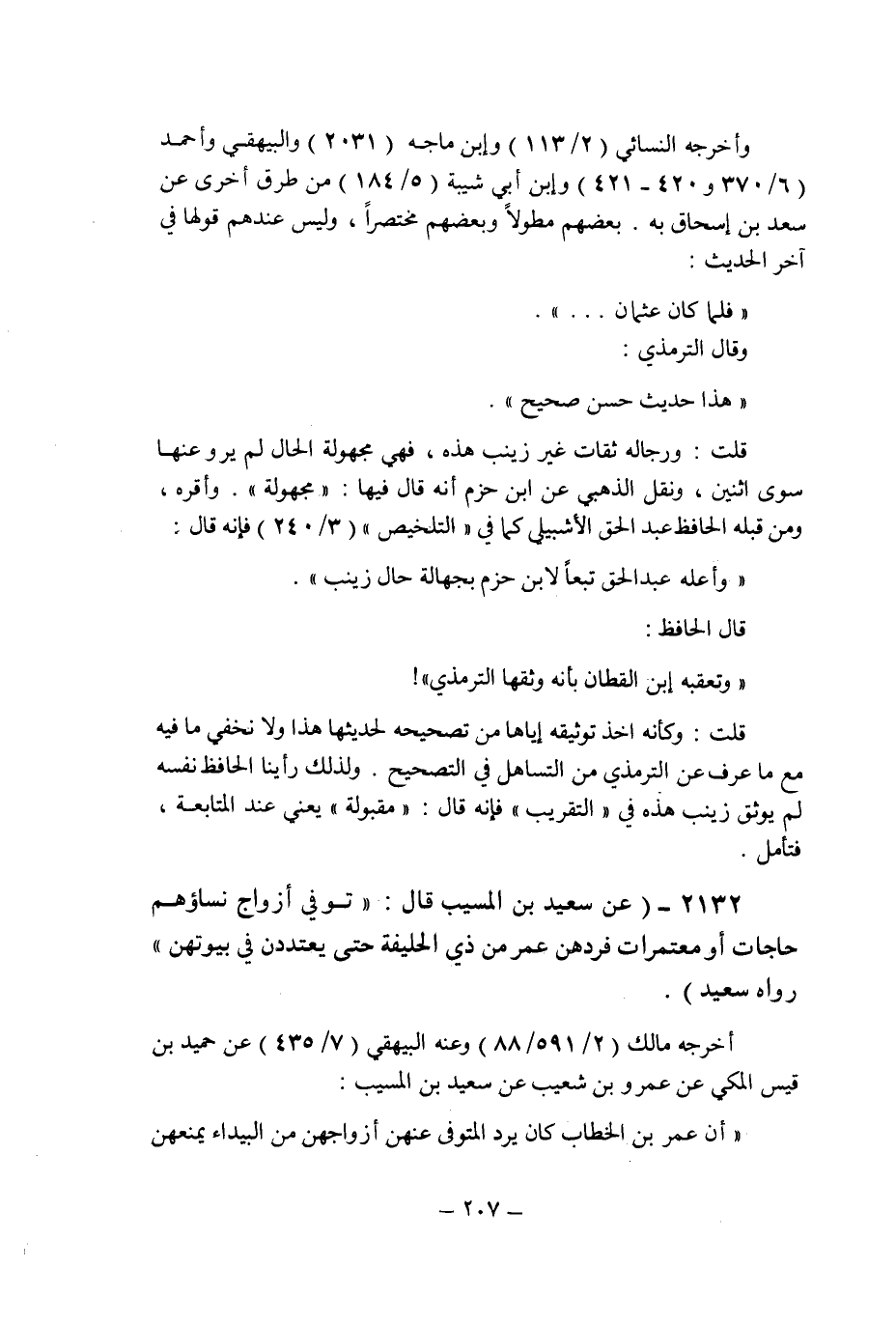 (2132) - (عن سعيد بن المسيب قال: " توفى أزواج نساؤهم حاجات أو معتمرات فردهن عمر من ذى الحليفة حتى يعتددن فى بيوتهن " رواه سعيد.