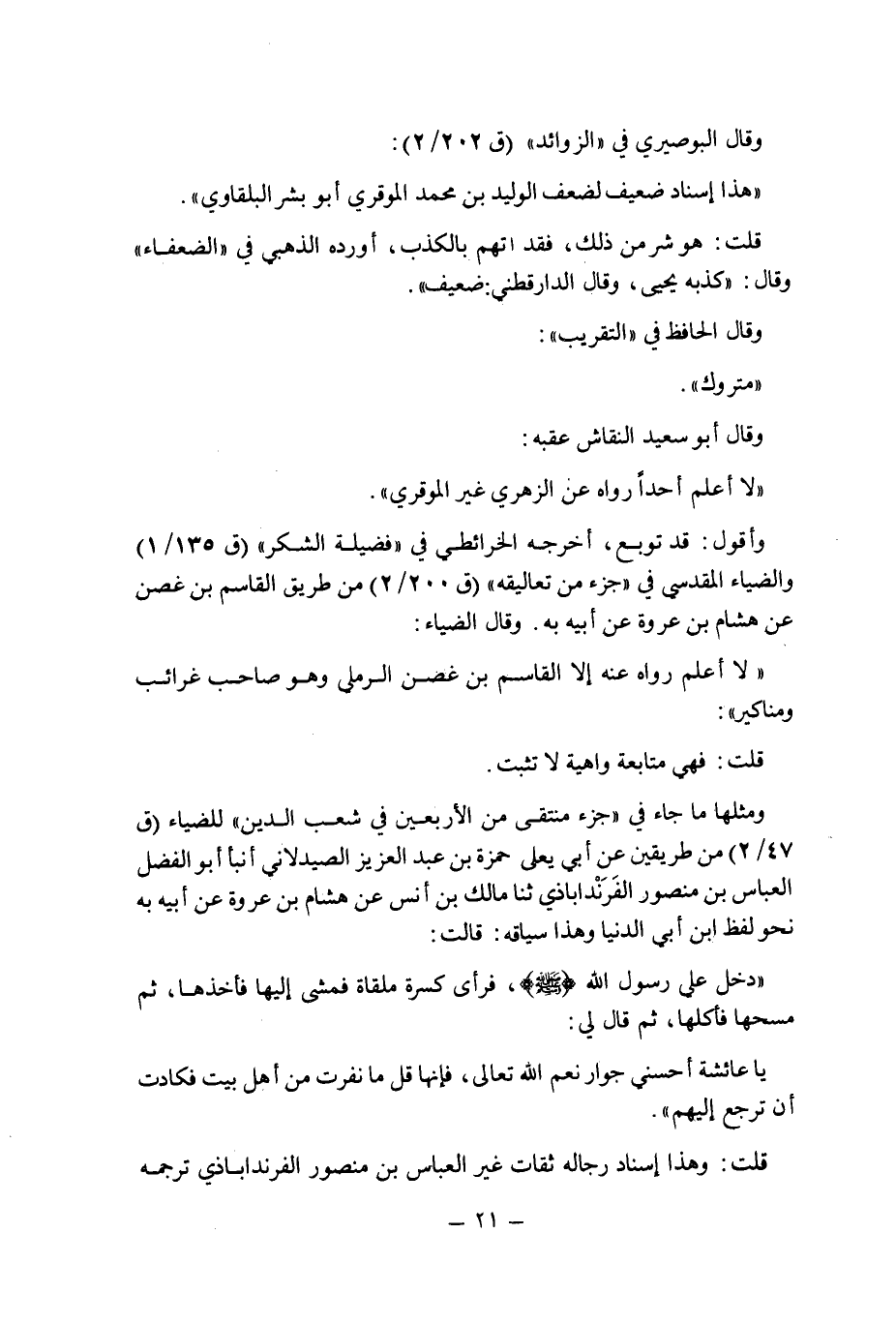 ومثلها ما جاء فى " جزء منتقى من الأربعين فى شعب الدين " للضياء (ق 47/2) من طريقين عن أبى يعلى حمزة بن عبد العزيز الصيدلانى أنبأ أبو الفضل العباس بن منصور الفرنداباذى حدثنا مالك بن أنس عن هشام بن عروة عن أبيه به نحو لفظ ابن أبى الدنيا وهذا سياقه: " قالت: " دخل على رسول الله صلى الله عليه وسلم , فرأى كسرة ملقاة فمشى إليها فأخذها , ثم مسحها فأكلها , ثم قال لى: يا عائشة أحسنى جوار نعم الله تعالى , فإنها قل ما نفرت من أهل بيت فكادت أن ترجع إليهم ".