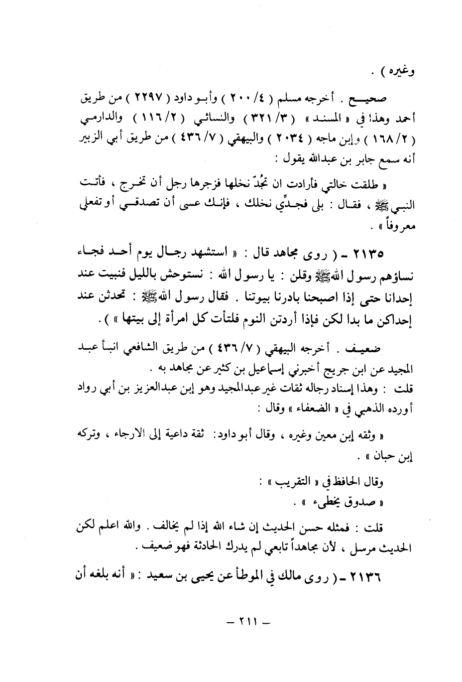 أخرجه مسلم (4/200) وأبو داود (2297) من طريق أحمد وهذا فى " المسند " (3/321) والنسائى (2/116) والدارمى (2/168) وابن ماجه (2034) والبيهقى (7/436) من طريق أبى الزبير أنه سمع جابر بن عبد الله يقول: " طلقت خالتى فأرادت أن تجذ نخلها فزجرها رجل أن تخرج , فأتت النبى صلى الله عليه وسلم , فقال: بل فجدى نخلك , فإنك عسى أن تصدقى أو تفعلى معروفا ".