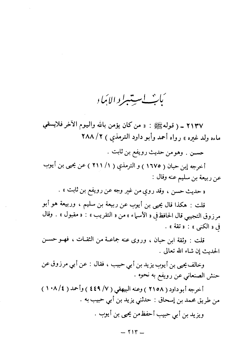 (2137) - (قوله صلى الله عليه وسلم: " من كان يؤمن بالله واليوم الآخر فلا يسقى ماءه ولد غيره " رواه أحمد وأبو داود والترمذى (2/288) .