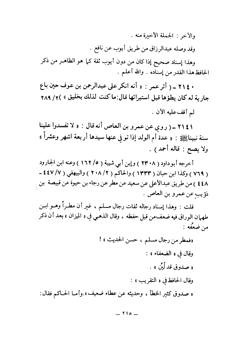 (2141) - (روى عن عمرو بن العاص أنه قال: " لا تفسدوا علينا سنة نبينا صلى الله عليه وسلم عدة أم الولد إذا توفى عنها سيدها أربعة أشهر وعشرا " ولا يصح قاله أحمد.