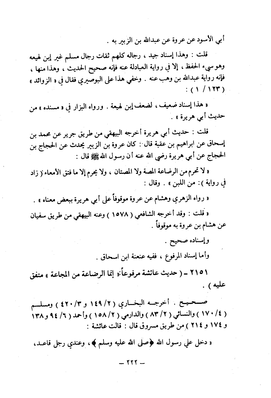 قلت: حديث أبى هريرة أخرجه البيهقى من طريق جرير عن محمد بن إسحاق عن إبراهيم بن عقبة قال: كان عروة بن الزبير يحدث عن الحجاج بن الحجاج عن أبى هريرة رضى الله عنه أن رسول الله صلى الله عليه وسلم قال: " لا تحرم من الرضاعة المصة ولا المصتان , ولا يحرم إلا ما فتق الأمعاء ـ زاد فى رواية: من اللبن ـ ".