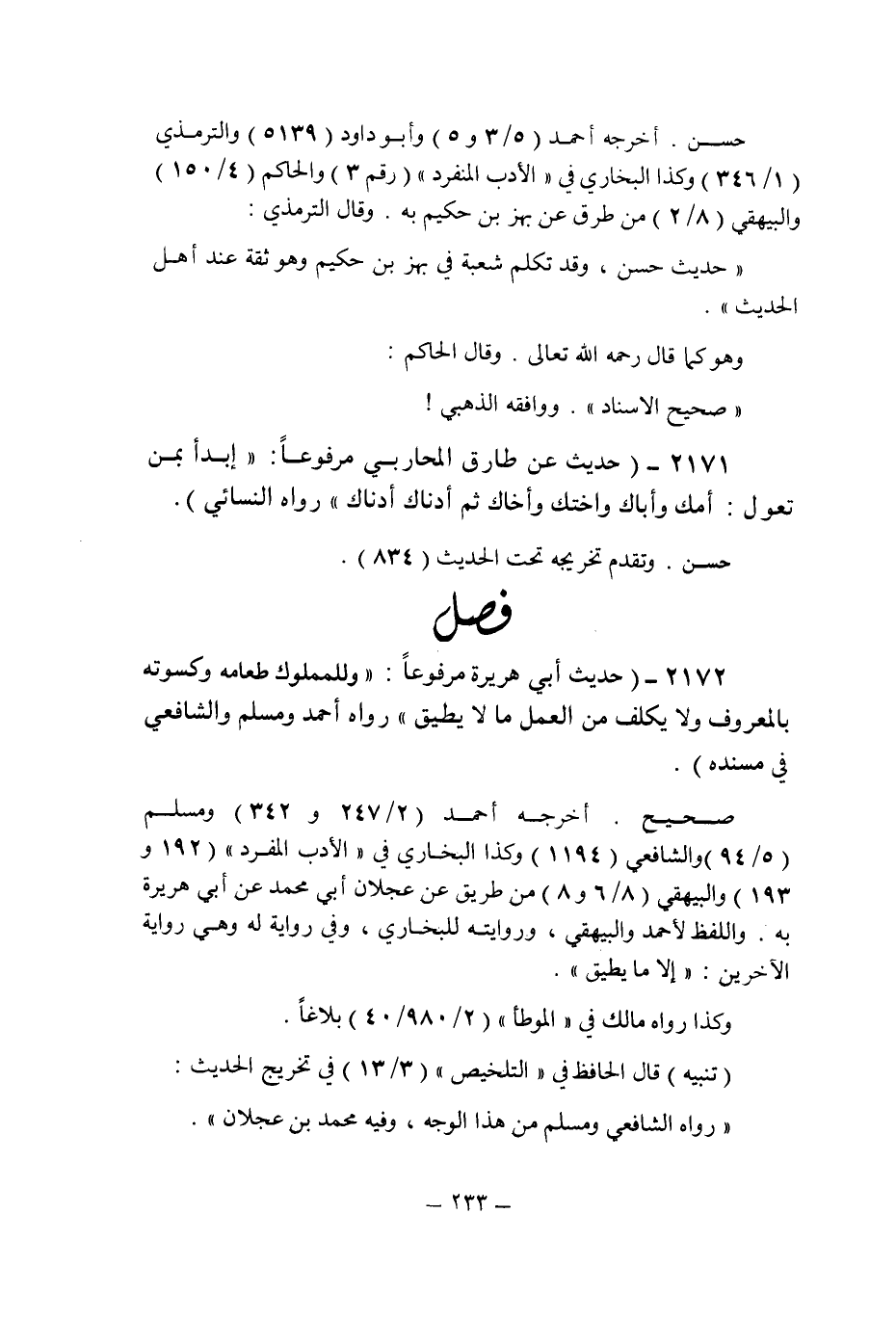 (2172) - (حديث أبى هريرة مرفوعا: " وللمملوك طعامه وكسوته بالمعروف ولا يكلف من العمل ما لا يطيق " رواه أحمد ومسلم والشافعى فى مسنده.