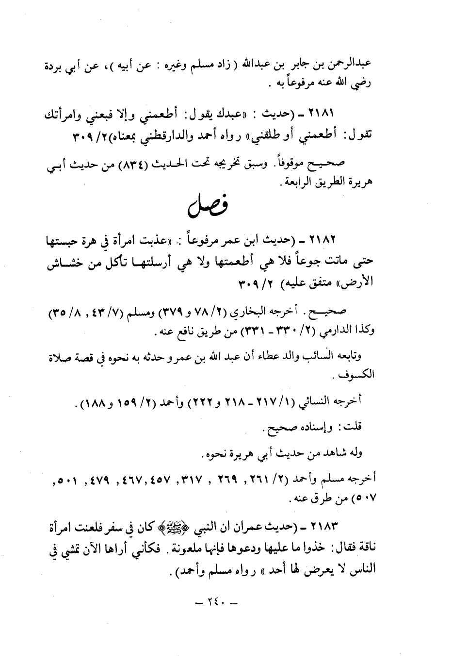 (2182) - (حديث ابن عمر مرفوعا: " عذبت امرأة فى هرة حبستها حتى ماتت جوعا فلا هى أطعمتها ولا هى أرسلتها تأكل من خشاش الأرض " متفق عليه (2/309) .