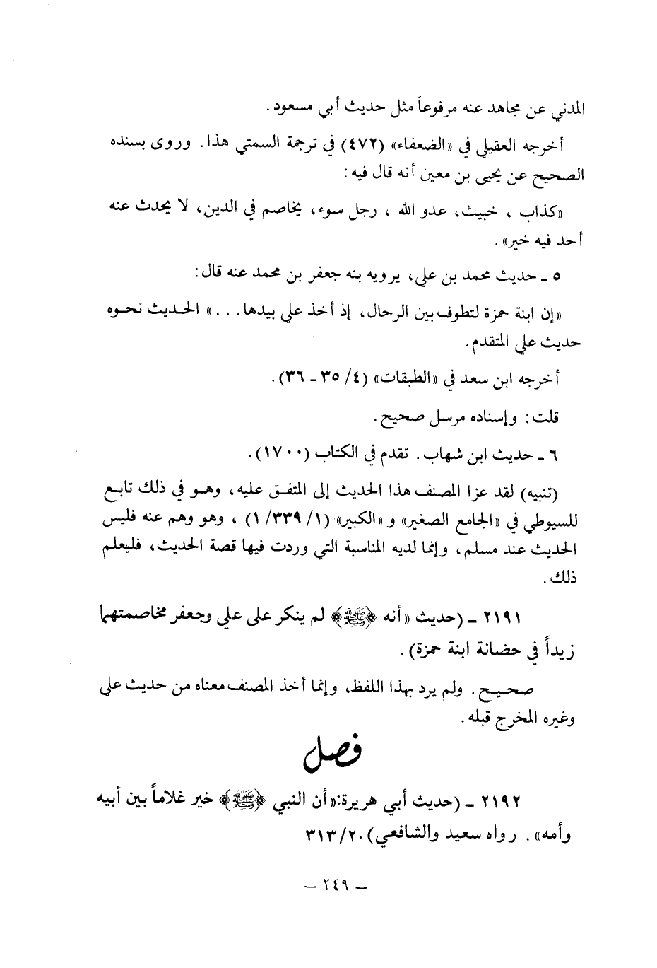 (2191) - (حديث: " أنه صلى الله عليه وسلم لم ينكر على على وجعفر مخاصمتهما زيدا فى حضانة ابنة حمزة ".