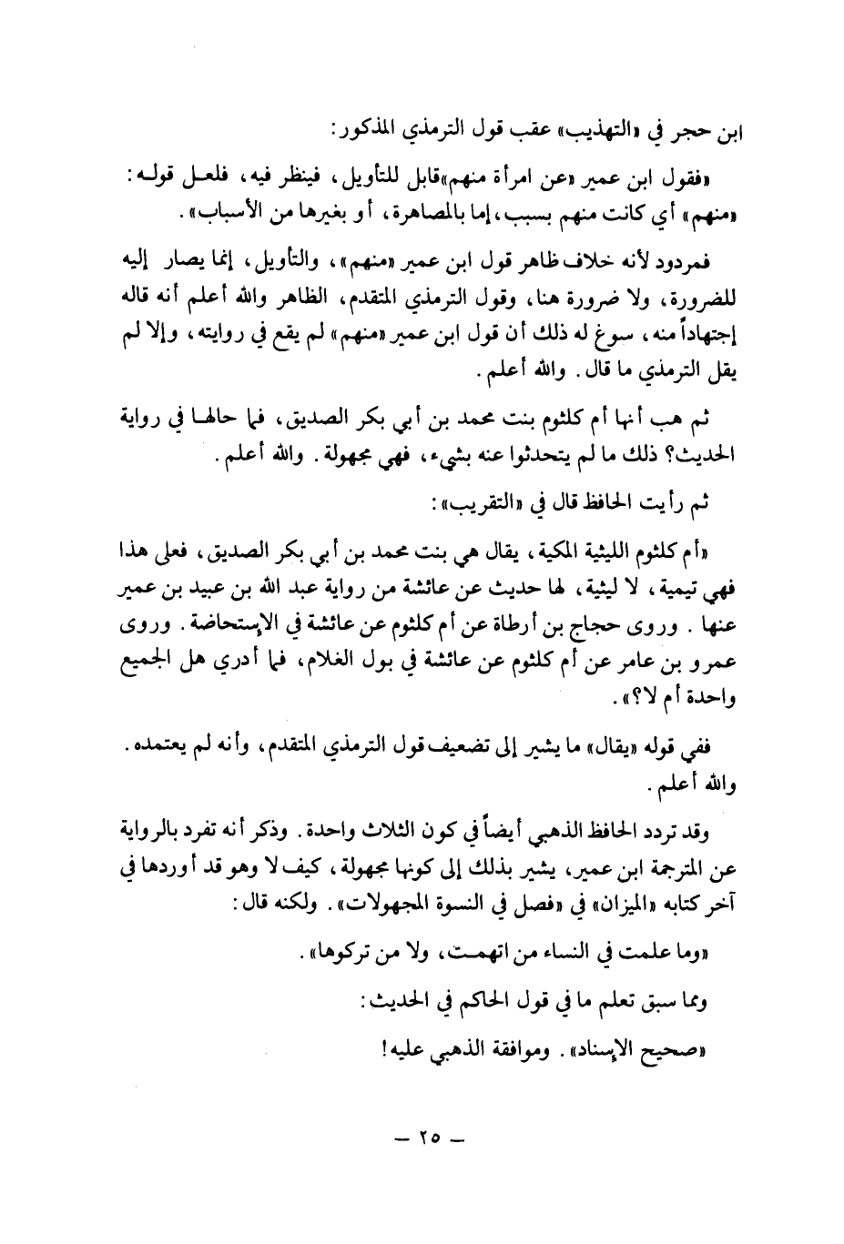 ابن حجر فى " التهذيب " عقب قول الترمذى المذكور: " فقول ابن عمير " عن امراة منهم " قابل للتأويل , فينظر فيه , فلعل قوله: " منهم " أى كانت منهم بسبب , إما بالمصاهرة , أو بغيرها من الأسباب ".