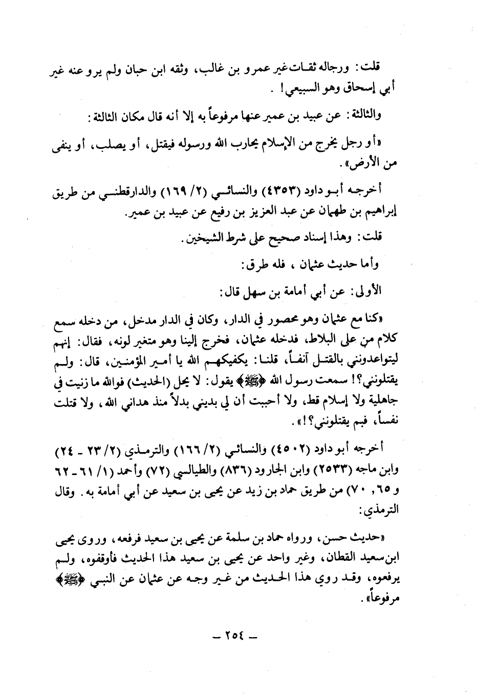 الأولى: عن أبى أمامة بن سهل قال: " كنا مع عثمان وهو محصور فى الدار , وكان فى الدار مدخل , من دخله سمع كلام من على البلاط , فدخله عثمان , فخرج إلينا وهو متغير لونه , فقال: إنهم ليتواعدوننى بالقتل آنفا , قلنا: يكفيكهم الله يا أمير المؤمنين , قال: ولم يقتلوننى؟ ! سمعت رسول الله صلى الله عليه وسلم يقول: لا يحل (الحديث) فوالله ما زنيت فى جاهلية ولا إسلام قط , ولا أحببت أن لى بدينى بدلا منذ هدانى الله , ولا قتلت نفسا , فبم يقتلوننى؟!