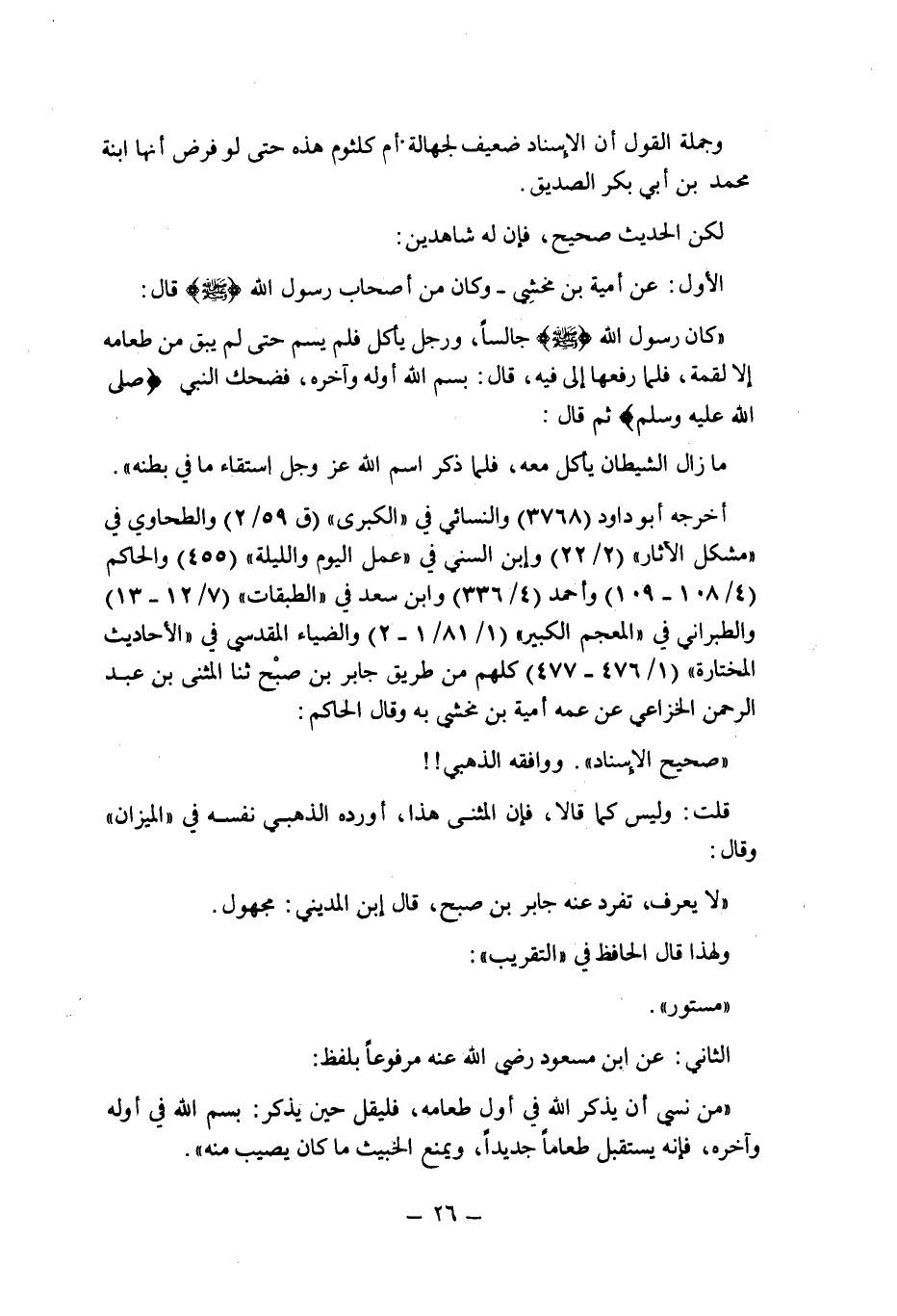 الأول: عن أمية بن مخشى ـ وكان من أصحاب رسول الله صلى الله عليه وسلم قال: " كان رسول الله صلى الله عليه وسلم جالسا , ورجل يأكل فلم يسم حتى لم يبق من طعامه إلا لقمة , فلما رفعها إلى فيه , قال: بسم الله أوله وآخره , فضحك النبى صلى الله عليه وسلم ثم قال: ما زال الشيطان يأكل معه , فلما ذكر اسم الله عز وجل استقاء ما فى بطنه " أخرجه أبو داود (3768) والنسائى فى " الكبرى " (ق 59/2) والطحاوى فى " مشكل الآثار " (2/22) وابن السنى فى " عمل اليوم والليلة " (455) والحاكم (4/108 ـ 109) وأحمد (4/336) وابن سعد فى " الطبقات " (7/12 ـ 13) والطبرانى فى " المعجم الكبير " (1/81/1 ـ 2) والضياء المقدسى فى " الأحاديث المختارة " (1/476 ـ 477) كلهم من طريق جابر بن صبح حدثنا المثنى بن عبد الرحمن الخزاعى عن عمه أمية بن مخشى به وقال الحاكم: " صحيح الإسناد ".