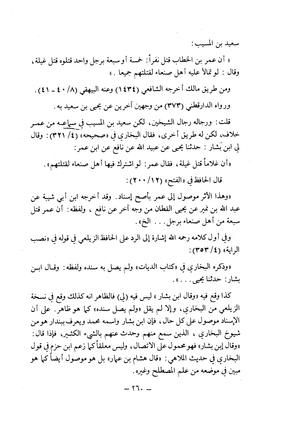 قلت: ورجاله رجال الشيخين , لكن سعيد بن المسيب فى سماعه من عمر خلاف , لكن له طريق أخرى , فقال البخارى فى " صحيحه " (4/321) : وقال لى ابن بشار: حدثنا يحيى عن عبيد الله عن نافع عن ابن عمر: " أن غلاما قتل غيلة , فقال عمر: لو اشترك فيها أهل صنعاء لقتلتهم ".