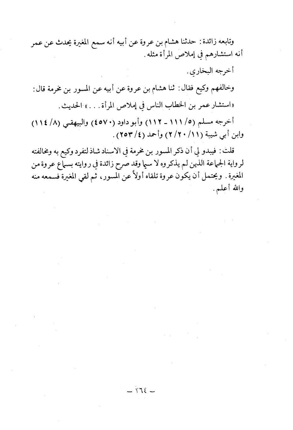 قلت: فيبدو لى أن ذكر المسور بن مخرمة فى الإسناد شاذ لتفرد وكيع به ومخالفته لرواية الجماعة الذين لم يذكروه لاسيما وقد صرح زائدة فى روايته بسماع عروة من المغيرة.