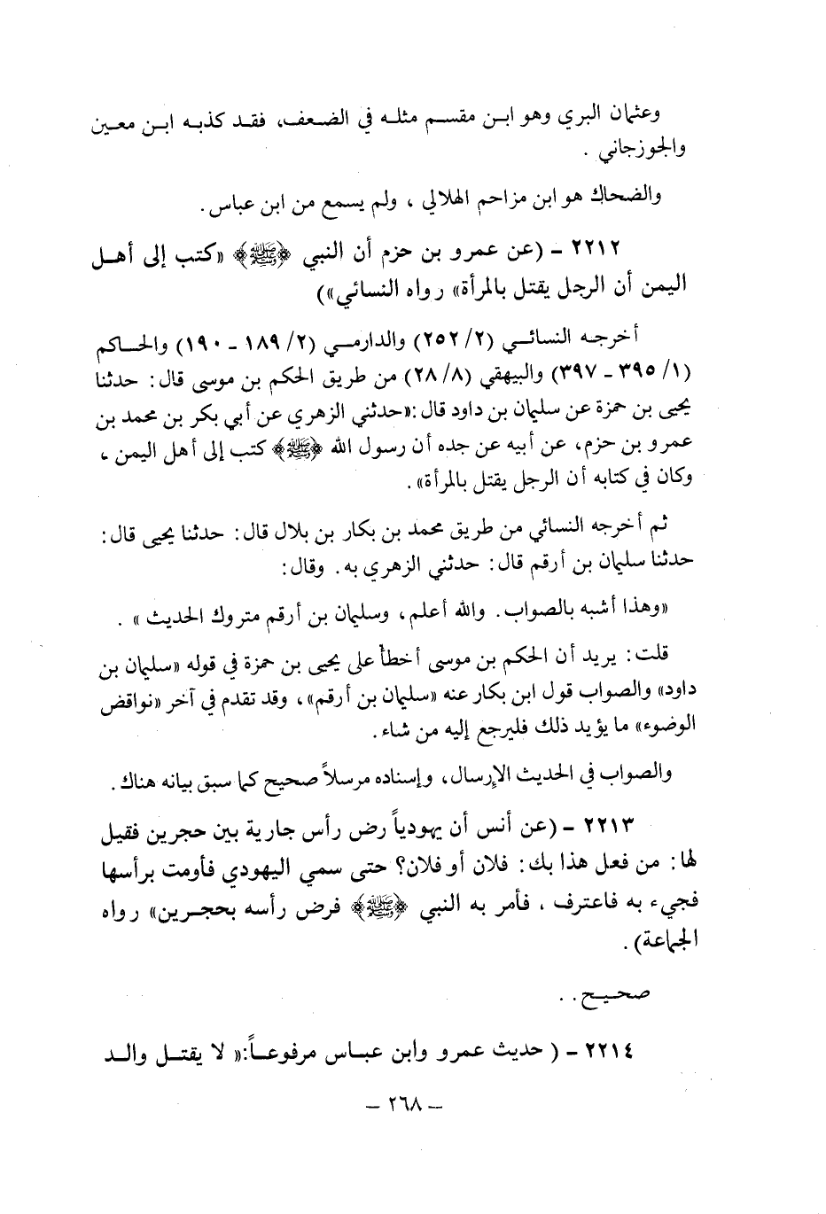 (2212) - (عن عمرو بن حزم أن النبى صلى الله عليه وسلم: " كتب إلى أهل اليمن أن الرجل يقتل بالمرأة " رواه النسائى ".