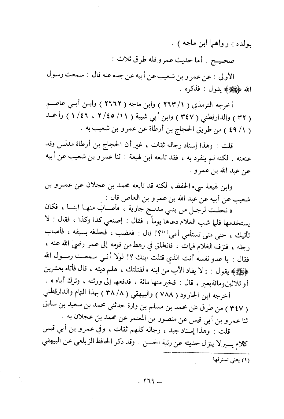 وابن لهيعة سىء الحفظ , لكنه قد تابعه محمد بن عجلان عن عمرو بن شعيب عن أبيه عن عبد الله بن عمرو بن العاص قال: " نحلت لرجل من بنى مدلج جارية , فأصاب منها ابنا , فكان يستخدمها فلما شب الغلام دعاها يوما , فقال: اصنعى كذا وكذا , فقال: لا تأتيك , حتى متى تستأمى أمى (1) ؟! قال: فغضب , فحذفه بسيفه , فأصاب رجله , فنزف الغلام فمات , فانطلق فى رهط من قومه إلى عمر رضى الله عنه , فقال: يا عدو نفسه أنت الذى قتلت ابنك؟ ! لولا أنى سمعت رسول الله صلى الله عليه وسلم يقول: " لا يقاد الأب من ابنه " لقتلتك , هلم ديته , قال فأتاه بعشرين أو ثلاثين ومئة بعير , قال: فخير منها مئة , فدفعها إلى ورثته , وترك أباه ".