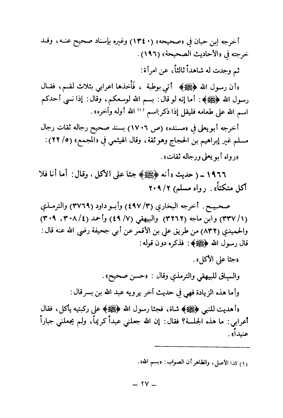 (1966) - (حديث: " أنه صلى الله عليه وسلم جثا على الأكل , وقال: أما أنا فلا آكل متكئا " رواه مسلم (2/209) .
