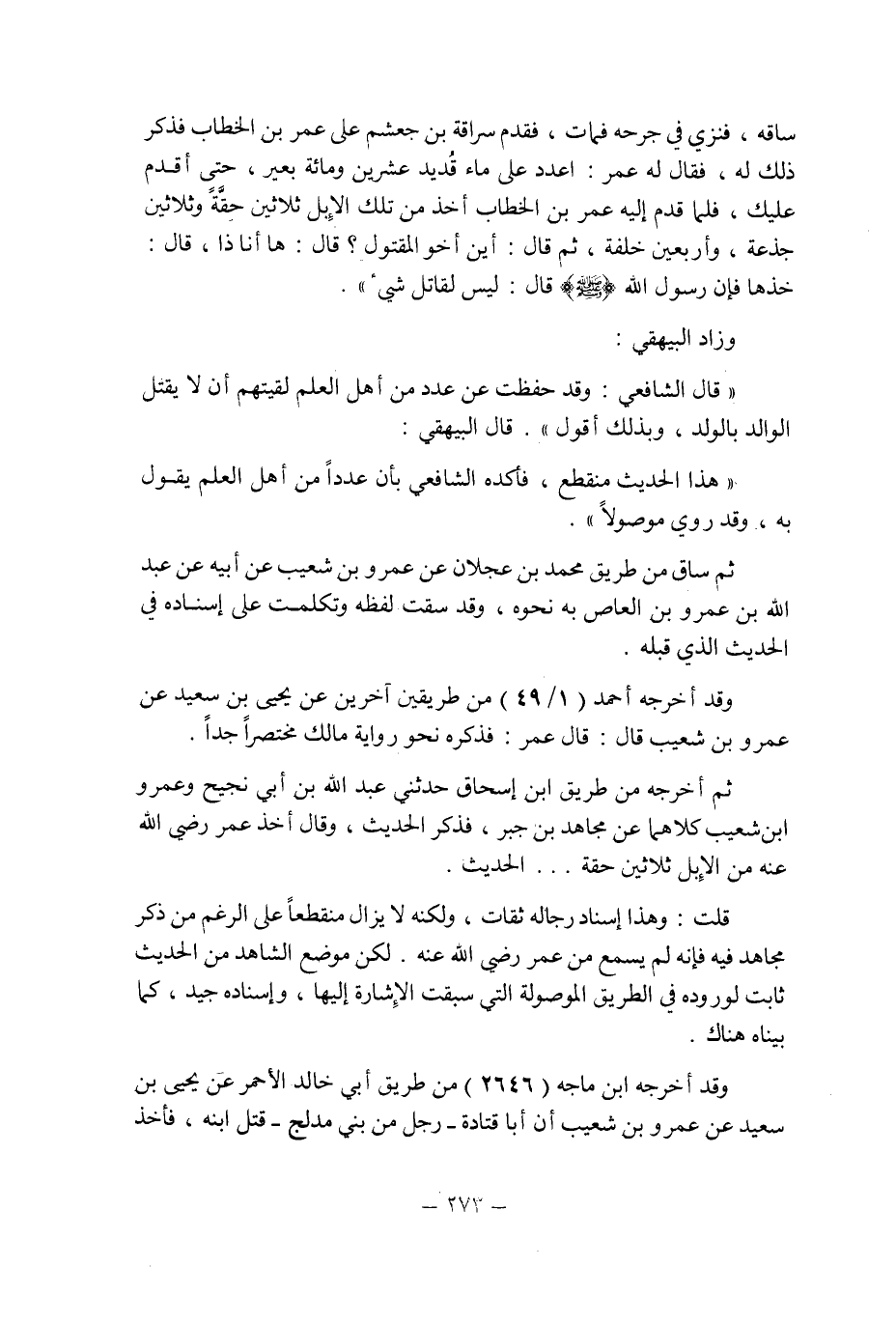 وزاد البيهقى: " قال الشافعى: وقد حفظت من عدد من أهل العلم لقيتهم أن لا يقتل الوالد بالولد , وبذلك أقول ".
