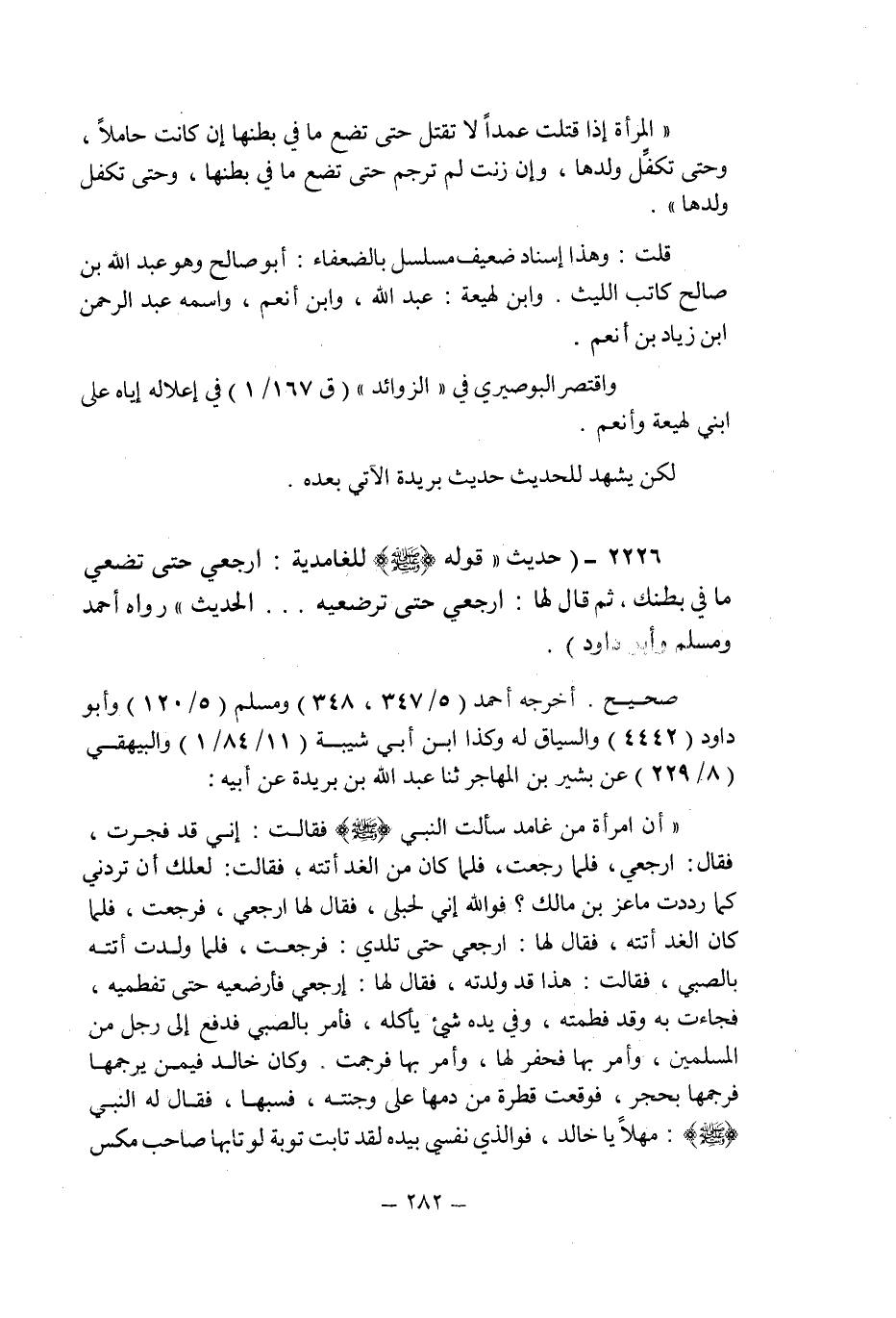 (2226) - (حديث: " قوله صلى الله عليه وسلم للغامدية: ارجعى حتى تضعى ما فى بطنك , ثم قال لها: ارجعى حتى ترضعيه ... الحديث " رواه أحمد ومسلم وأبو داود.
