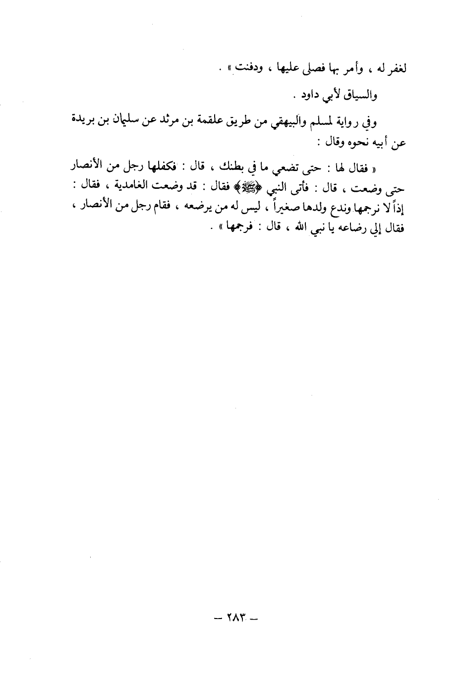 وفى رواية لمسلم والبيهقى من طريق علقمة بن مرثد عن سليمان بن بريدة عن أبيه نحوه وقال: " فقال لها: حتى تضعى ما فى بطنك قال: فكفلها رجل من الأنصار حتى وضعت , قال: فأتى النبى صلى الله عليه وسلم فقال: قد وضعت الغامدية , فقال: إذا لا نرجمها وندع ولدها صغيرا , ليس له من يرضعه , فقام رجل من الأنصار , فقال إلى رضاعه يا نبى الله , قال: فرجمها ".