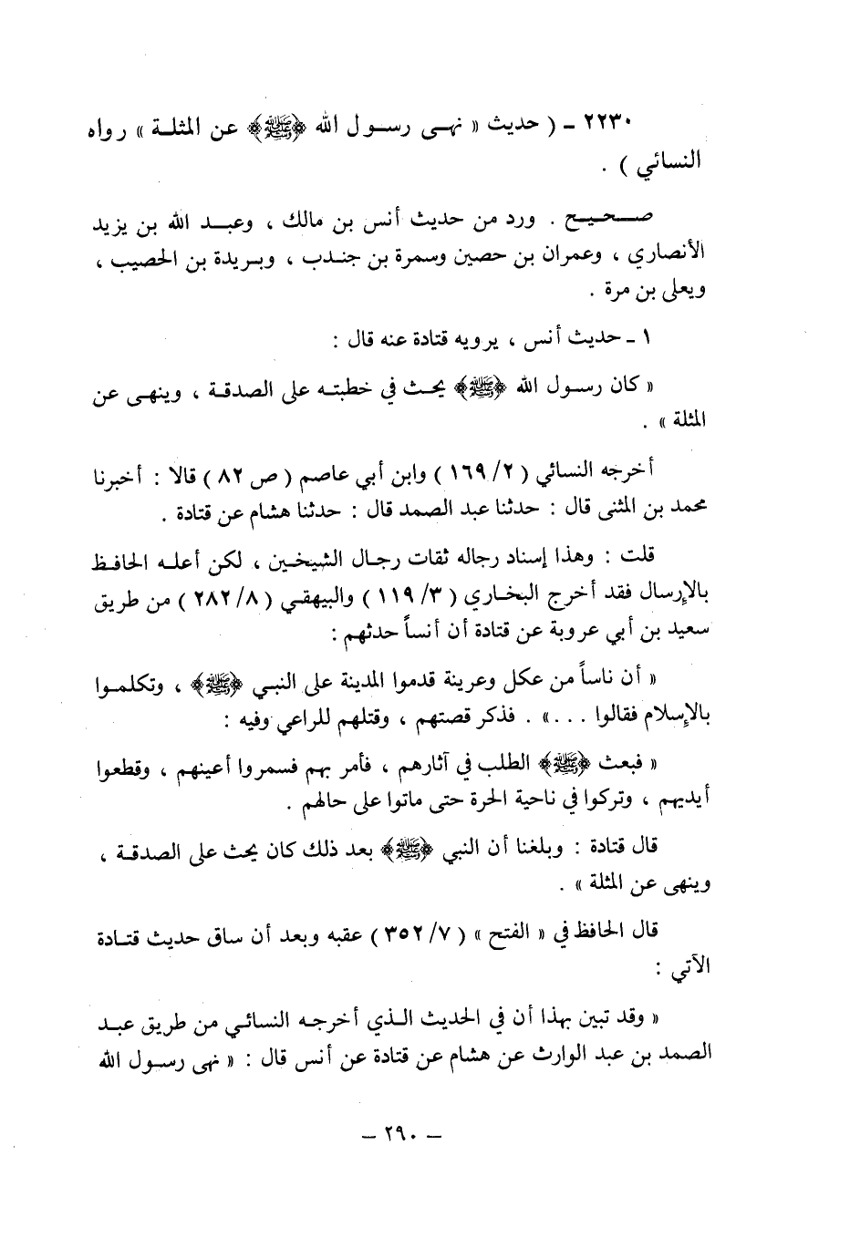 قال الحافظ فى " الفتح " (7/352) عقبه وبعد أن ساق حديث قتادة الآتى: " وقد تبين بهذا أن فى الحديث الذى أخرجه النسائى من طريق عبد الصمد بن عبد الوارث عن هشام عن قتادة عن أنس قال: " نهى رسول الله