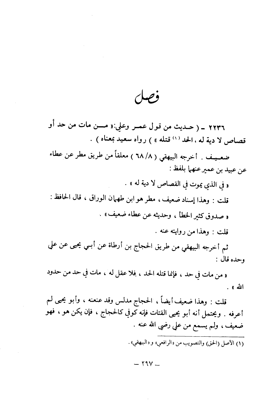 (2236) - (حديث من قول عمر وعلى: " من مات من حد أو قصاص لا دية له , الحد (1) قتله " رواه سعيد بمعناه.