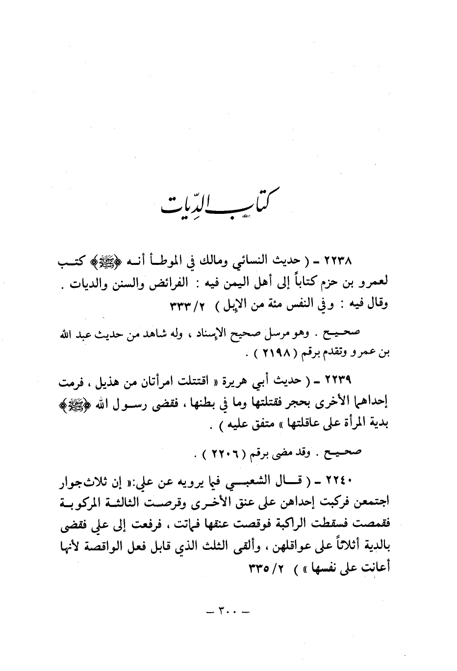 (2238) - (حديث النسائى ومالك فى الموطأ: " أنه صلى الله عليه وسلم كتب لعمرو بن حزم كتابا إلى أهل اليمن فيه: الفرائض والسنن والديات , وقال فيه: وفى النفس مائة من الإبل " (2/333) .