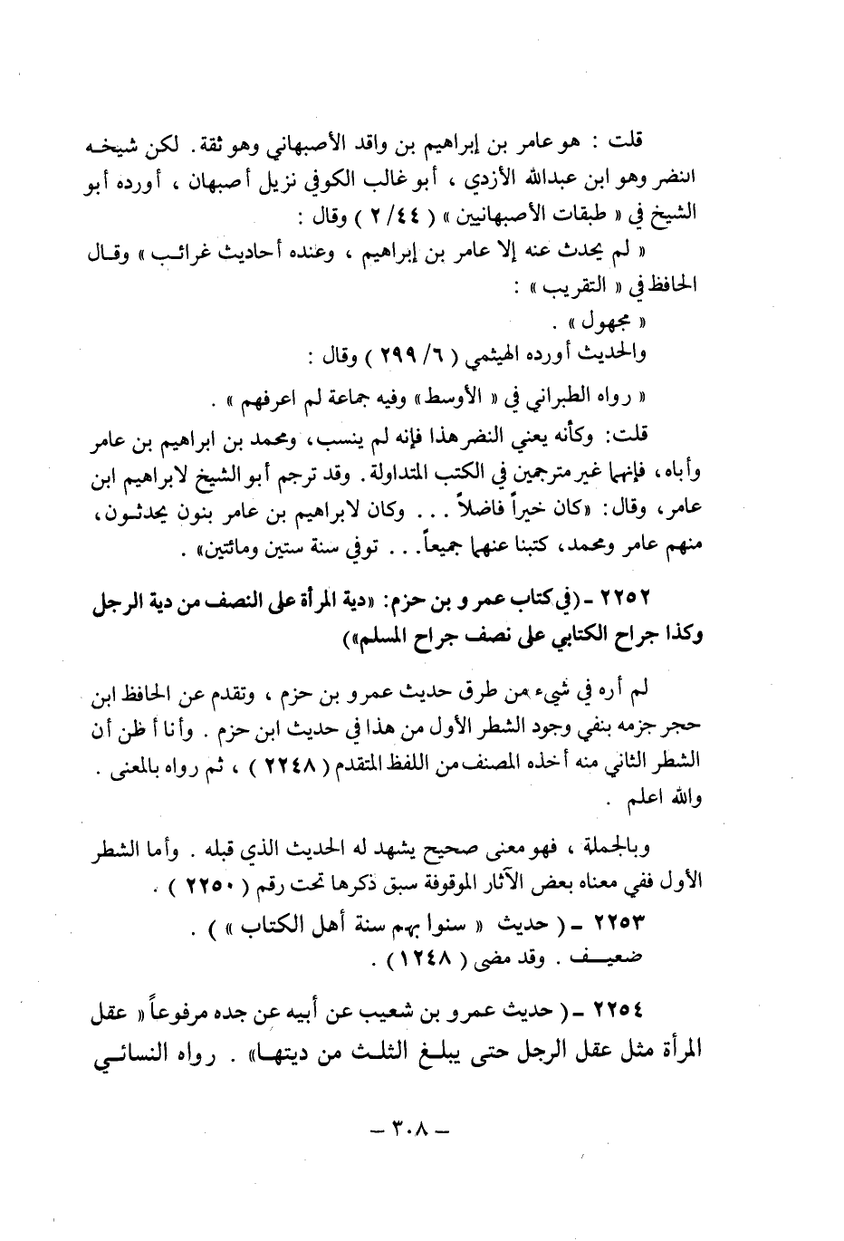 (2252) - (فى كتاب عمرو بن حزم: " دية المرأة على النصف من دية الرجل وكذا جراح الكتابى على نصف جراح المسلم ".