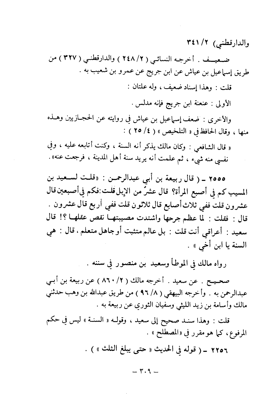 (2555) - (قال ربيعة بن أبى عبد الرحمن: " قلت لسعيد بن المسيب كم فى أصبع المرأة؟ قال عشر من الإبل قلت: فكم فى أصبعين؟ قال: عشرون , قلت: ففى ثلاث أصابع؟ قال: ثلاثون , قلت: ففى أربع؟ قال: عشرون , قال: فقلت: لما عظم جرحها واشتدت مصيبتها نقص عقلها؟ ! قال سعيد: أعراقى أنت؟ قلت: بل عالم متثبت أو جاهل متعلم , قال: هى السنة يا ابن أخى " رواه مالك فى الموطأ وسعيد بن منصور فى سننه [1] .