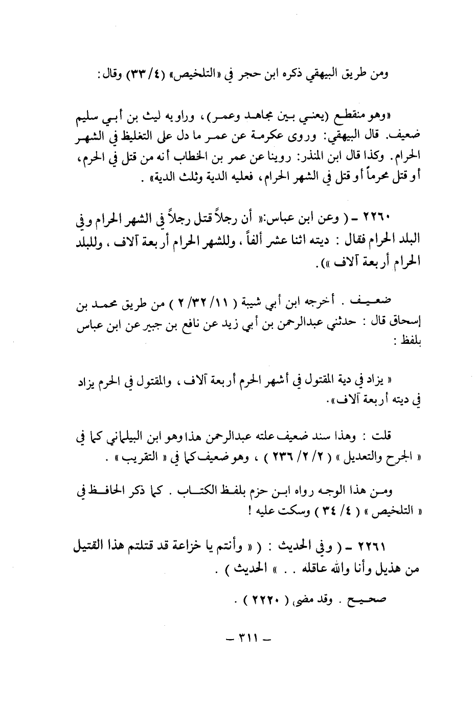 (2260) - (وعن ابن عباس: " أن رجلا قتل رجلا فى الشهر الحرام وفى البلد الحرام فقال: ديته اثنا عشر ألفا , وللشهر الحرام أربعة * ضعيف.
