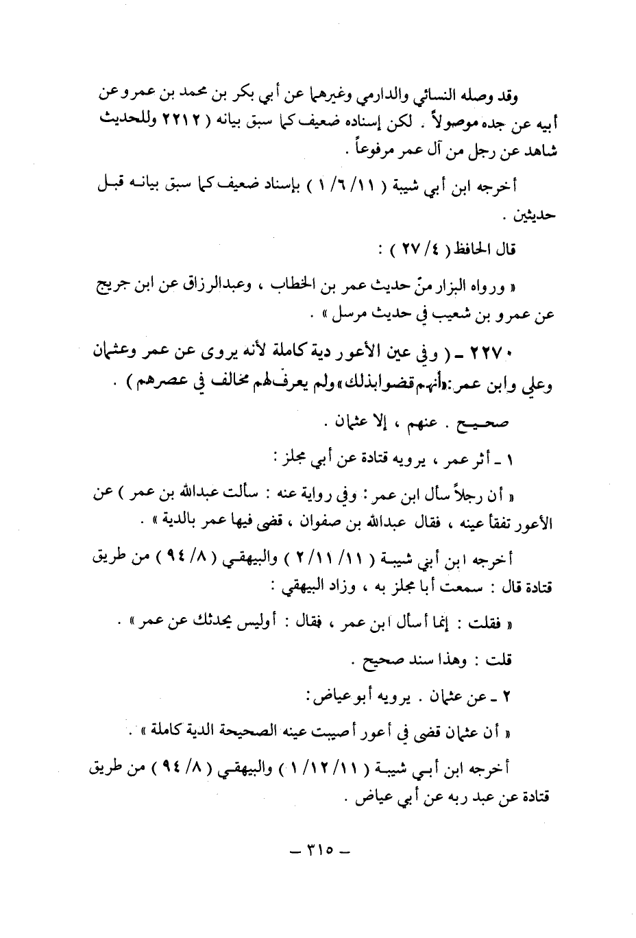 (2270) - (وفى عين الأعور دية كاملة لأنه يروى عن عمر وعثمان وعلى وابن عمر: " أنهم قضوا بذلك " ولم يعرف لهم مخالف فى عصرهم.