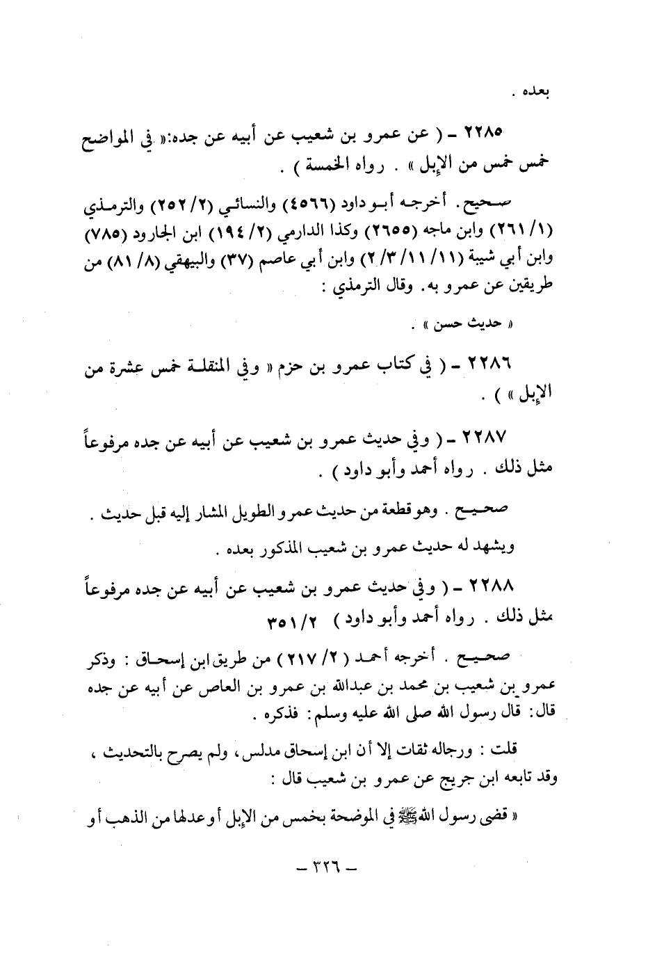 (2285) - (عن عمرو بن شعيب عن أبيه عن جده: " فى المواضح خمس خمس من الإبل " رواه الخمسة.